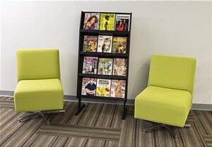 This floor standing wooden literature shelving features a 4-tiered design with optional dividers to hold various magazines and brochures at libraries, schools, law firms, retail stores, and more. The modern catalog rack requires only a screwdriver to easily and quickly attach the legs to the stand. Our tiered black floor standing wooden literature shelving is built of solid oak with a robust and durable construction that will last for years to come. This USA made display will add a professional, modern appearance to your business, providing patrons with reading material. Use the optional dividers provided with our black solid oak display to switch out magazines for folded brochures when desired. This easy-to-assemble floor standing wooden literature shelving is perfect for providing take-away reading material, pamphlets about local attractions for instance, with visitors at cafes, shopping centers, law firms, and more.