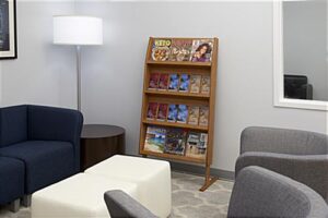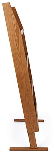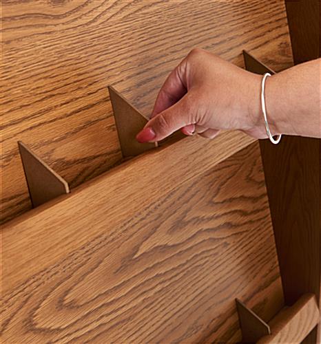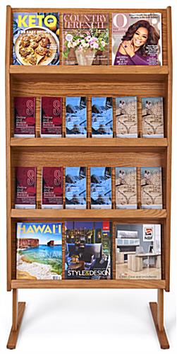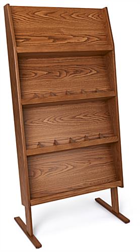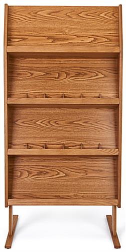 This magazine holder features a sleek medium oak 4-tiered display, perfect for showcasing brochures and catalogs in libraries, schools, offices, law firms, and more. The USA-made floor standing rack ships with all of the necessary hardware needed, making the assembly process quick and painless. Our wooden brochure and magazine holder includes pocket dividers to fit a minimum of 12 pamphlets and 24 catalogs, excellent for displaying various literature. This floor standing fixture is built of solid wood with a robust and durable construction that will last for years to come. The wooden medium oak tiered rack will add a professional, modern appearance to your business, providing patrons with reading material. Use this easy-to-assemble magazine holder to keep literature neat and organized while giving takeaway reading materials to visitors, patients, and customers.