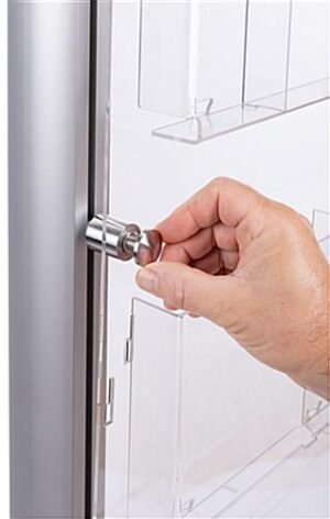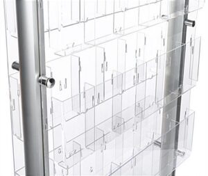 This adjustable acrylic floor brochure display stand is an ideal way to distribute your written materials to guests. The double-sided literature holder features 48 pockets that can be made double-wide to accommodate magazines and flyers by simply removing the divider. Locking casters allow you to move the acrylic floor brochure display stand from one location to another. Standing 6’ tall this literature holder is sure to grab attention and entice guests to approach and take a magazine or flyer from one of the pockets. This double-sided unit is ideal for use in a travel agency, visitors center, airport, financial center, or lodging area. Use this floor brochure display stand as a stylish method for distributing your literature to guests!