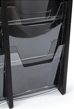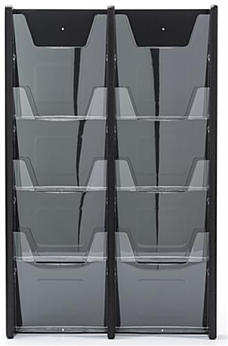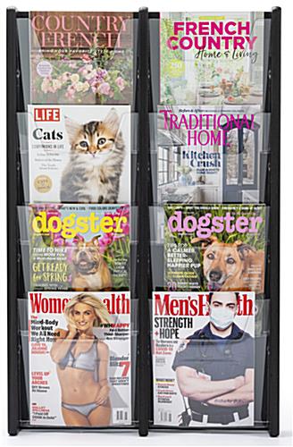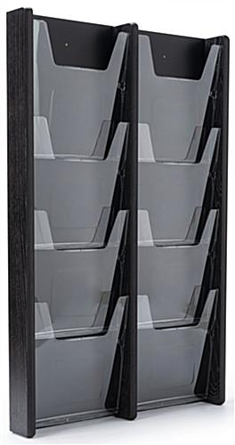 This 8 pocket magazine holder has 4 tiered front panels made of clear acrylic to prevent catalogs from wrinkling or falling out of place. This literature rack is constructed of solid oak wood with a black finish, ideal for professional settings like doctor’s offices, real estate agencies, and law firms. This tiered 8 pocket magazine holder adds a modern look with its clear acrylic front panels, which provide an unobstructed view from what’s inside. Feature this literature rack in waiting rooms to give patrons something to read as they wait or advertise promotional materials. This catalog organizer comes fully assembled with pre-drilled holes on the backside, making installation easy. This black 8 pocket magazine holder is an excellent way to remain organized and professional, while making reading materials more accessible to customers.