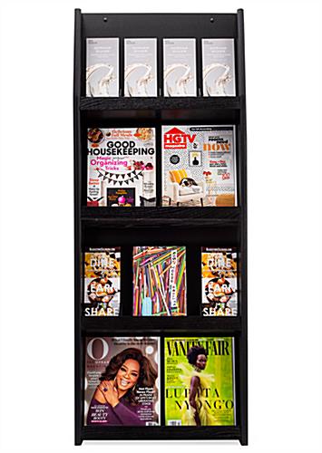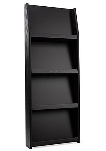 The four shelf wall literature display is designed to accommodate 8.5″ x 11″ magazines and 4″ x 9″ tri-fold brochures.