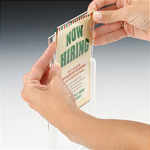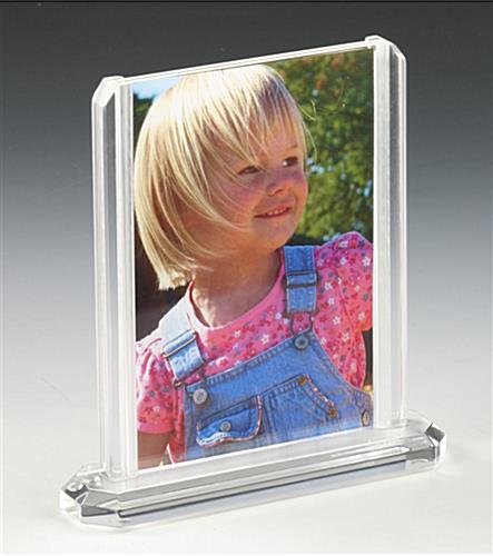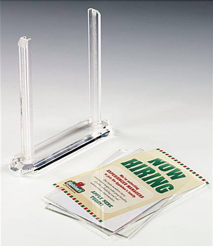 The .5″ thick clear plastic displays, such as acrylic photo holders can also display your favorite images at home. The vertical 4″ x 6″ design sheets are held tightly in place between 2 plastic display panels. These plastic panels rest on a sturdy .5″ thick stand with rubber feet. These versatile tabletop holders, clear plastic displays provide simple assembly for quick changes. Just slide the panels up for easy top loading.