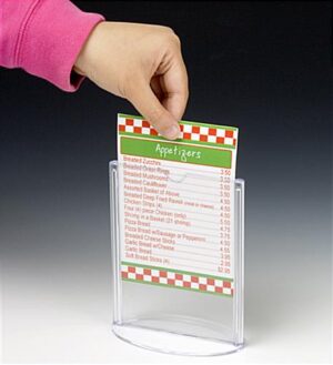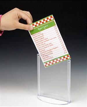 4″ x 6″ Inserts slide into the opening located on the top of this restaurant menu holder that is stylish. The fact that signs slide into the display makes it easy to update daily if needed. There is even a thumb notch on this restaurant menu holder for workers to remove old signs quickly. These countertop card displays feature an injection molded plastic construction. This restaurant menu holder that is clear costs much less than a unit made from acrylic or metal. Additionally, the light weight of each card stand makes it inexpensive to ship as well. This restaurant menu holder is specifically designed for mass utilization by dining facilities.