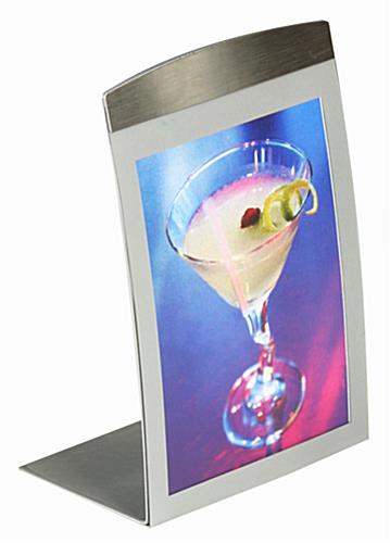 This silver picture frame, also known as a sign holder, is designed for use as a countertop display. This small photo display is suitable for home, retail or restaurant environments. This silver picture frame is constructed from steel and can display 4″w x 6″h prints. This countertop display can be used for any form of advertising, or even for personal usage. The photo holder, silver picture frame allows you to advertise pictures, menus, cards and notices. The neutral coloring of this holder enables users to place this unit in any type of setting. This photo holder is offered in many other sizes and styles in this online catalog.