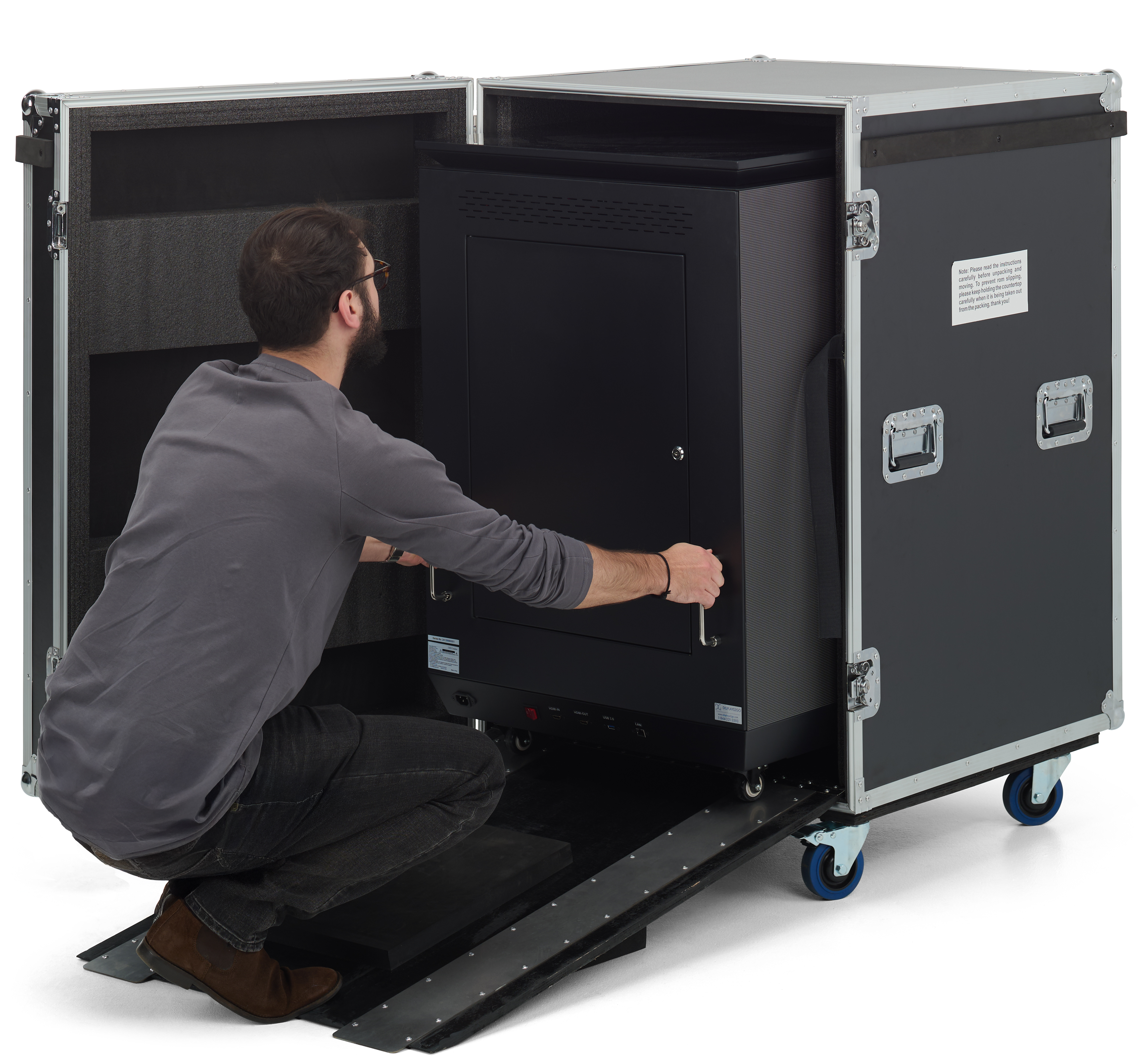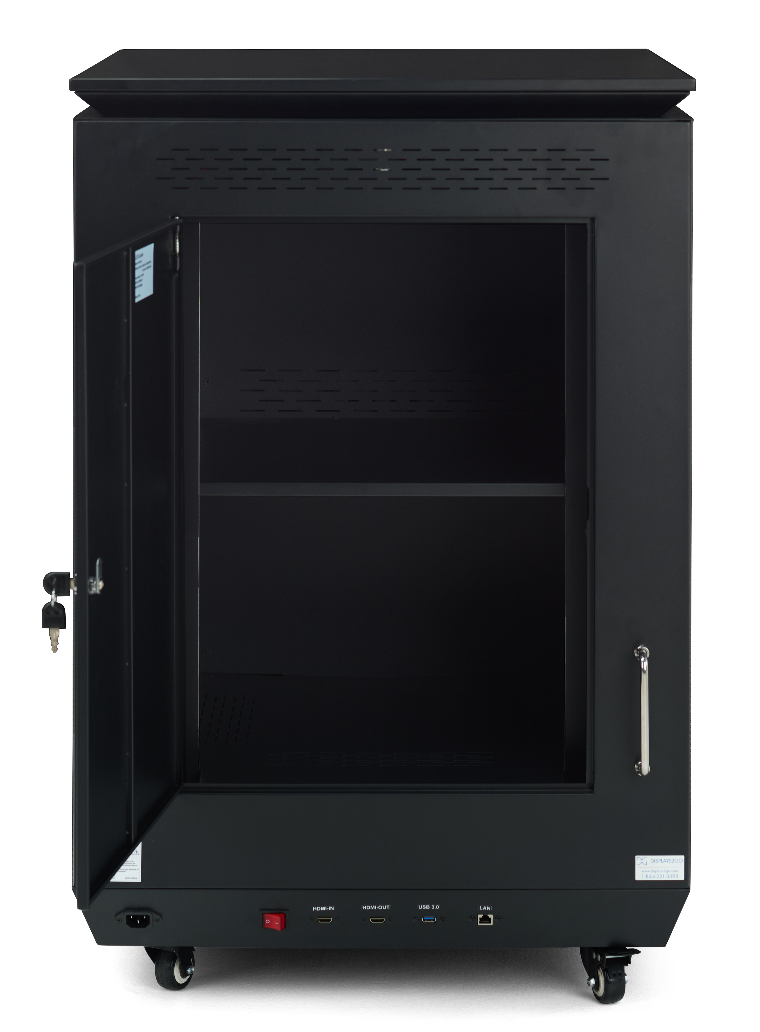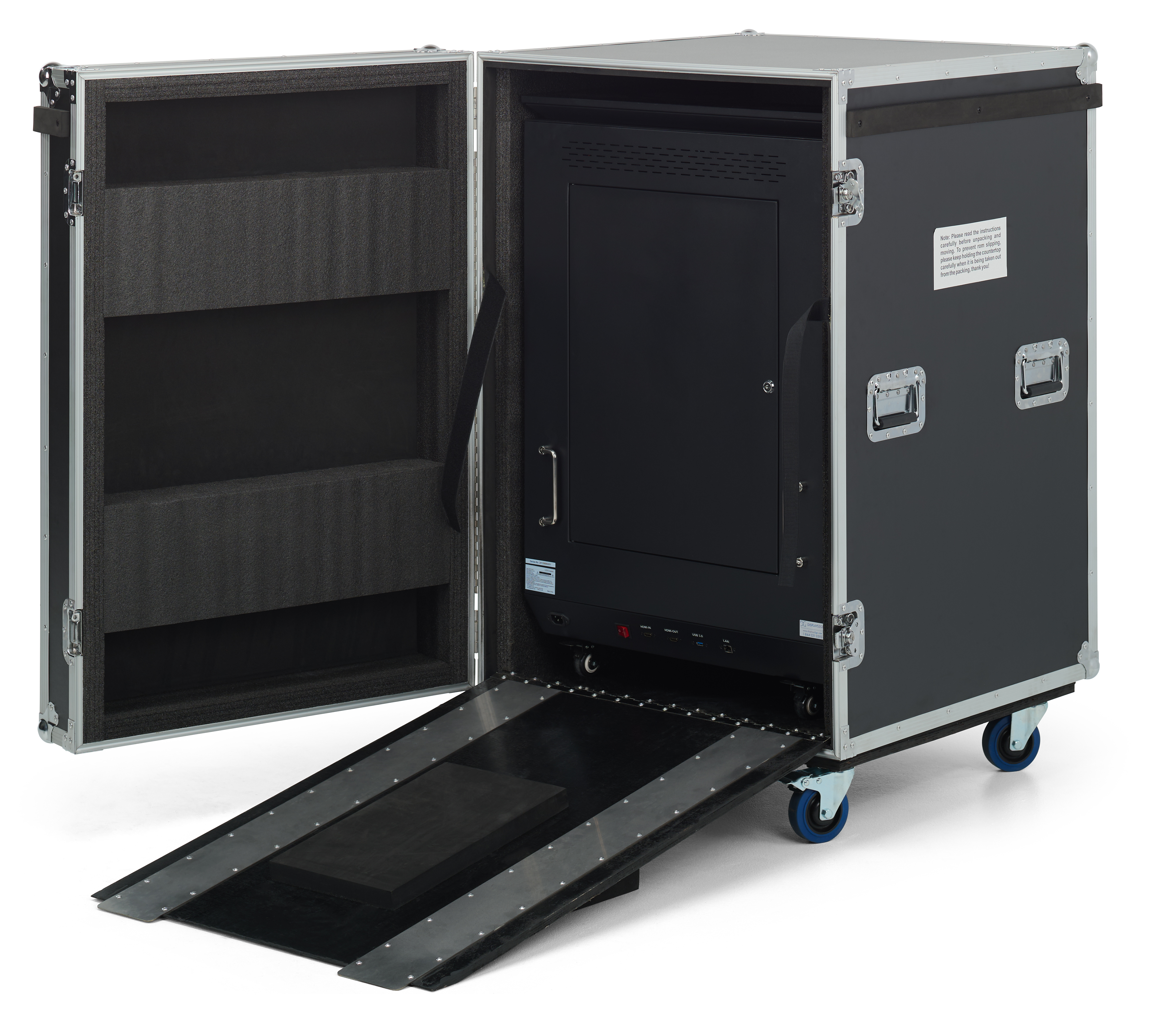 Three-Sided Digital Signage Totem with Storage Case with Built-In Ramp
