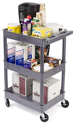 These service carts feature four swiveling casters that are great for sharp, accurate turns! Once in position; lock the wheels to prevent any unwanted movement. These utility totes, service carts also have three, 2-3/4″ deep tubs for supplies and a 12″ clearance between each other. The durable plastic construction can withstand heavy loads without cracking or breaking. These service carts, also known as industrial trucks, have a smooth, easy to clean surface so messy jobs are no problem! Simply use a mild detergent to clean it, or take the unit outside and hose it off. A truly multi-purpose design allows these bus carts to be used for food and coffee service, equipment hauling or supplies storage!