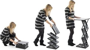 This folding literature counter is a fantastic promotional aid that doubles as a magazine stand and work space. With 3 standard size periodical pockets and a 20” wide table top, the display rack is a necessary portable accessory for trade shows and exhibits! Included with the promotional counter is a hard cover travel case that locks for easy, organized, and safe travel. Set up is fast by simply lifting the display rack into an upright position accordion style and locking the pins in place. The stand ships fully assembled! Showcase magazines inside the pockets and use the counter as a space for a laptop or product samples. The portable brochure and periodical stand is constructed of durable steel and MDF materials for long lasting use.