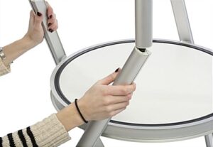 This pirouet portable twist counter is ideal for a trade show or retail environment, with its collapsible design and 2 shelves to promote merchandise. The display case pedestal is sold with a rolling bag for easy transport to and from an expo. Once you arrive at the event, lay the silver portable twist counter flat on the ground and turn clockwise for simple set-up that takes mere minutes. Then, insert up to 8 white flexible panels to create a unique trade show display case, either completely enclosing or allowing access to the interior. The white MDF top and shelves can support up to 22 lbs each, making this perfect for merchandising a variety of retail products. Once the expo is over, the flexible panels easily pop out of the twist counter and the collapsible pedestal can be packed away within the carrying bag until the next event. With an elegant yet functional design, this display case is sure to stand out in any environment and make a lasting impression with customers!