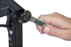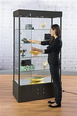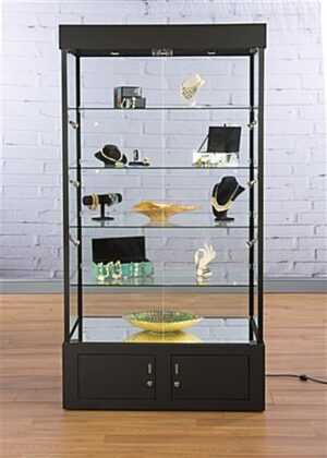 The black display case with mirrored bottom is great as a lobby or exhibit cabinet for presenting memorabilia. An enclosed base storage featured with the showcase area keeps curio hidden from unwarranted tampering by sliding channel locks. The locking crystal clear glass display case is fabricated from beautiful green edged tempered glass, anodized black aluminum and melamine for a sound and sturdy fixture. Adjustable feet allow leveling on uneven surfaces to keep the memorabilia inside steady and surfaced. (4) Crystal clear shelves are illuminated by (9) LED lights including (3) ceiling and (6) side spotlights featured inside the display case. A mirror on the base radiates from the bulbs for glamourous lighting and shadowing effects.