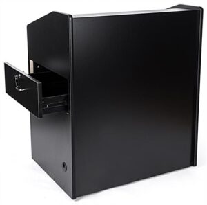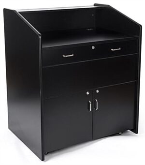 This wide rolling podium with cabinet is an excellent choice for high schools, universities, and vocational training centers. Bottom storage space and two drawers all have locks for securing AV equipment. The rolling podium with cabinet features cable management to keep all unsightly cords hidden within the unit. Locking wheels allow the stand to be easily transported from one classroom to another. The lectern has a wide working area of 39″ which provides ample room for laptops or notes for speeches and presentations. This podium with cabinet offers an ideal way to protect your investment while allowing convenient mobility at the same time!