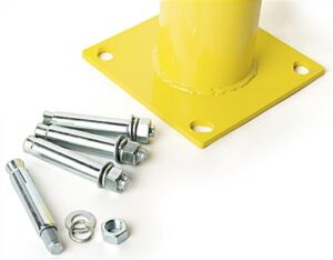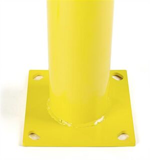 This fixed steel bollard surface mount is highly visible without being obtrusive, making it the optimal solution for preventing vehicles from pedestrian areas. Built with heavy-duty welded Q235 steel, this post has a removable cap allowing you to fill this pole with concrete for added reinforcement. This fixed steel bollard surface mount easily fastens to any surface, has a 10” x 10” base, and includes 4 steel nuts and bolts. A heavy-duty safety post can mark worksites and restricted areas or protect buildings and valuable assets. Durable and easy to install, both the embedded and base fixture models give you long-term protection for many different locations and needs. The high visibility yellow/black powder-coated finish on this steel bollard surface mount is the ideal security solution for storefronts, parking lots, mall entrances, and pedestrian walkways.
