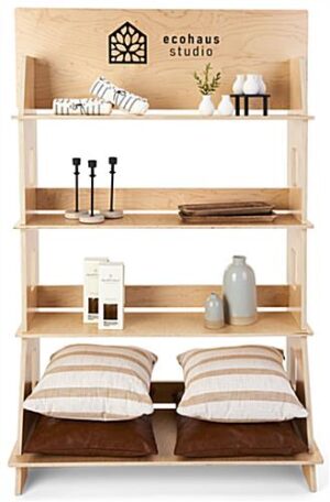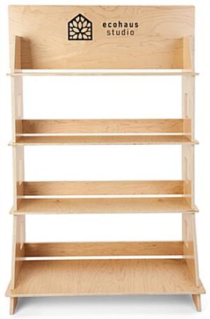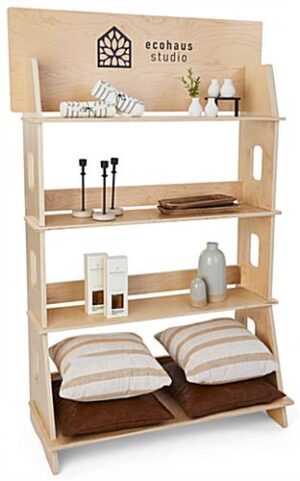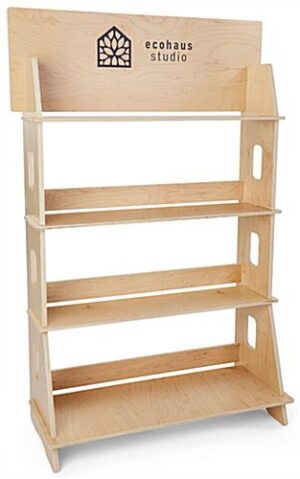 This custom-printed wooden shelf stand measures 44″ wide by 67.5″ tall, providing you with ample space to showcase bestselling or new products. As an alternative to traditional store fixtures, this portable 4-tier shelving is constructed of poplar wood core with an eco-friendly natural laminate finish, consciously designed to help reduce environmental impact. Perfect for trade shows, retail stores, and showrooms, this custom wooden shelf stand with branded header offers customers a full view of merchandised products like clothing, shoes, accessories, housewares, and more. Personalize this collapsible shelving display with your company’s logo or messaging to help raise brand awareness and captivate the attention of guests within high-traffic areas. Our custom wooden shelf stand has a modular design that allows it to be easily stored or transported. Use this portable 4-tier shelving with coordinating fixtures (sold separately) to maximize merchandising opportunities on your selling floor. Stage this eco-friendly floor standing display at your next traveling event to create a fully modernized and branded showcase that will make your inventory stand out!