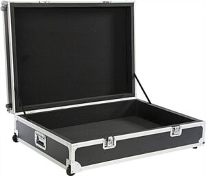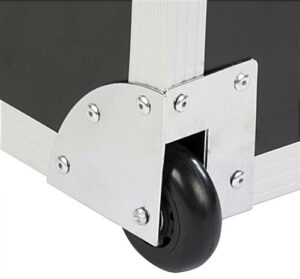 The expo equipment case features a large 42”W x 8.5”H x 29”D interior storage space to pack TV mounts, media components, product samples, literature, and other mechanisms to help organize exhibitor supplies while travelling. Designed to keep valuables safe, the entire inside casing is lined in EVA foam padding. 2 Fabric straps are featured with the trade show case that prevents the top cover from over extending and keeps it stable while packing and unpacking. 2 Non-locking wheels make it easy to transport the portable crate from a vehicle to a trade show exhibit booth. Also included are 2 recessed handles for lifting the case. Constructed of plywood and black fireproof ABS panels with non-rust modules, each exhibitor crate is a great choice to pack and store exhibit supplies while travelling.