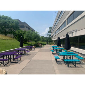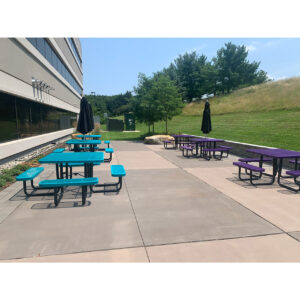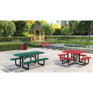 Create an outdoor setting that offers a beautiful space for a picnic lunch, with this 46″ square expanded picnic table. Designed to be used outdoors, year-round, this steel picnic table is a durable solution for your outdoor area needs. Whether you are looking to enhance a city park, or create a functional outdoor recess area on a school property, you’ll appreciate the variety of color options that this picnic table is offered in. Match your school colors with a blue picnic table, or design a natural-looking park setting with dark green picnic tables. These picnic tables are coated with thermoplastic. This is a great coating options, and will prove itself to be reliable as it stands up to the elements year-round. It won’t fade, crack, peel, warp or lose its bright color, no matter what the weather.