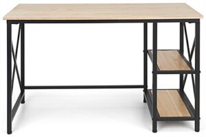 Our wood and steel desk measures 47″ W x 22″ D x 30″ H providing you with ample surface area for your computer and work files. The industrial-modern workstation has a practical design that will fit perfectly in any home or professional office space. This natural wood and steel desk has an overall weight capacity of 440lbs, allowing for flexibility in end-use. The two 20.75″ D x 9.25″ W built-in shelves provide you with plenty of storage space for your books, folders, décor items, and more. This industrial-modern workstation features a decorative black powder-coated X on each end for added design interest. Each foot features a rubber leveler allowing you to adjust the stability of your table with ease to suit your comfort. Each storage shelf has an overall weight capacity of 110lbs, allowing you to store a wide range of work-related items conveniently. This industrial wood and steel desk will modernize any home or corporate office space and pair perfectly with XSHF6NAT or XSHF5NAT for a well-rounded matching furniture set.