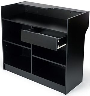 Our cash register counter stand offers everything a small business needs for establishing a smooth customer checkout experience. Manufactured from black melamine, the wooden construction provides a dependable and sturdy platform for completing transactions. This cash register counter stand features a recessed well with a convenient ledgetop for customer interaction. On the employee side of the unit, there’s plenty of storage space with two height adjustable shelves for customizing as you see fit. Our cash register counter stand also comes with a non-locking drawer for keeping small items or supplies close at hand. Thanks to the sizable 48″ length, this retail cash wrap can accommodate any type of checkout system, from cash registers to tablet card readers and/or swipers.