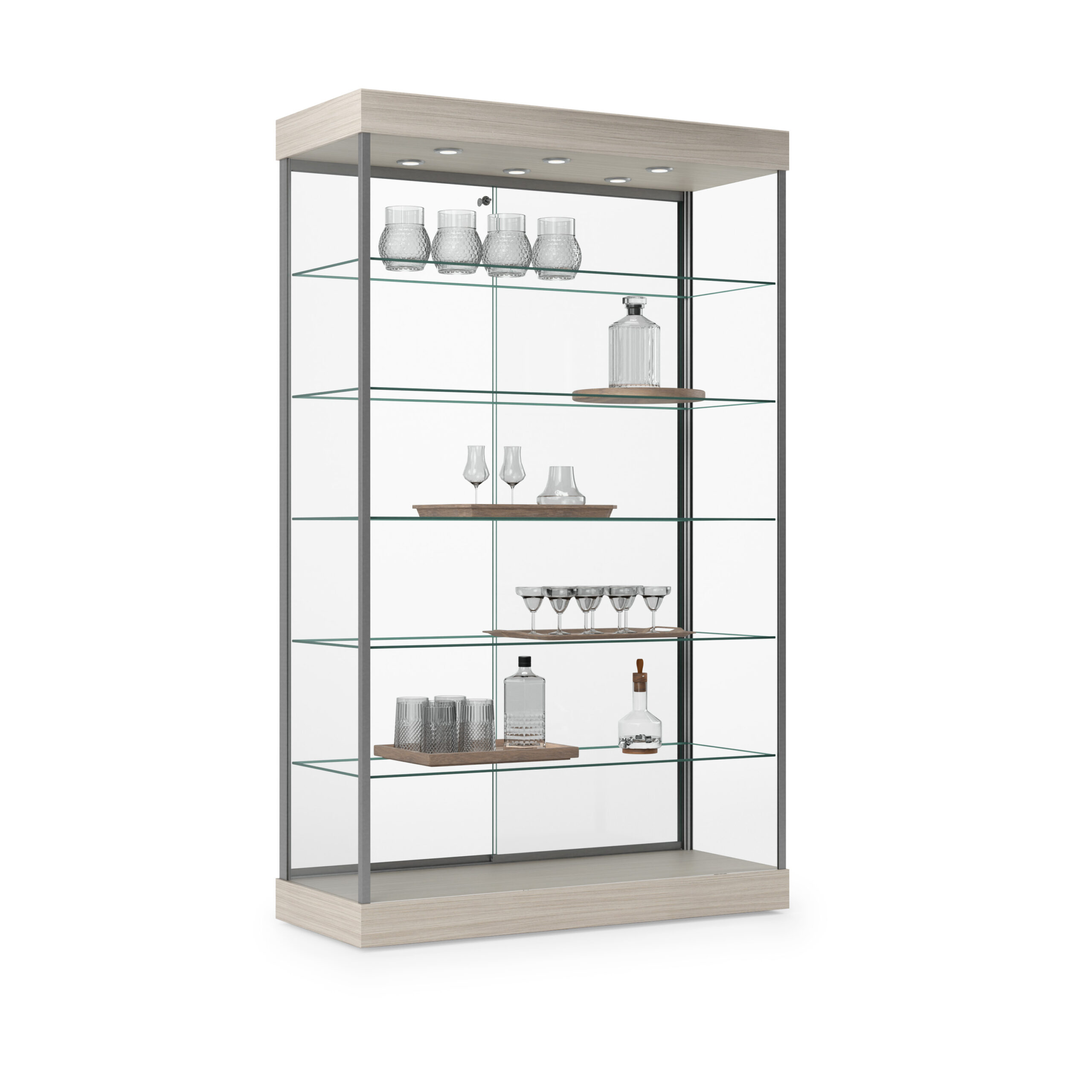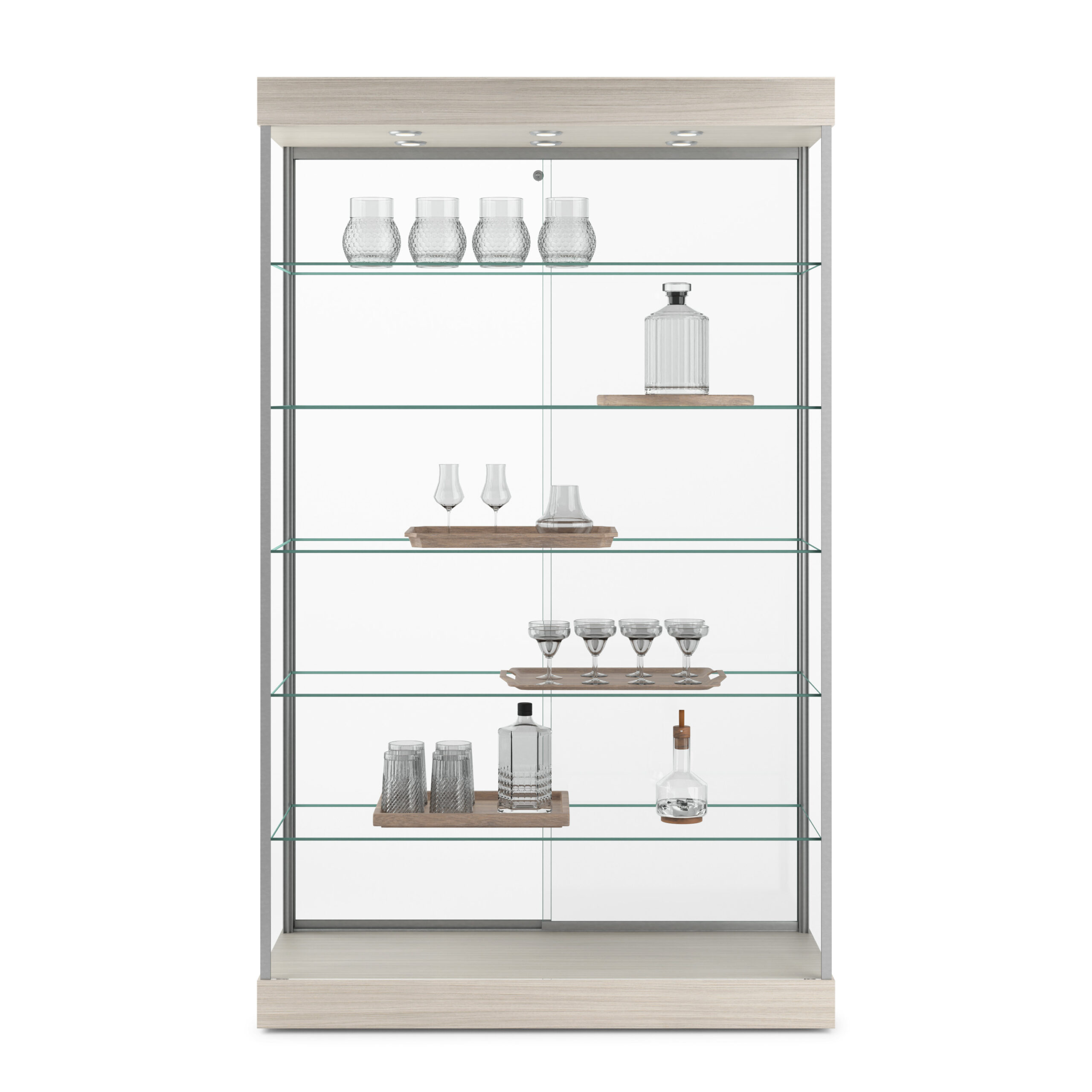 This frameless display case is designed to elevate your retail display game with its sleek, modern look and practical features. It is available in a premium Concrete Groovz finish and features full-view clear tempered glass panels that ensure a complete, unobstructed view of your items from every angle. This cabinet features five adjustable glass shelves to accommodate various items and six LED top lights to brilliantly illuminate your merchandise, drawing attention and enhancing the visibility of your collectibles or merchandise. The locking, sand liding glass doors provide added security, while the convenient wheels allow for effortless movement and placement. This frameless display case is perfect for retail spaces, offices, or education institutions and offers style, durability, and functionality in one impressive showcase.