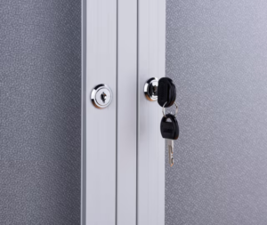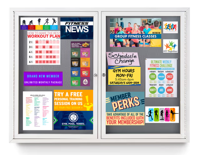 This indoor enclosed bulletin board cabinet with fabric backed corkboard will organize any notices within your gym, library, hotel, school, or conference room. Keep all messages protected with the shatterproof polycarbonate swinging doors and secure locking mechanism with two keys. This indoor enclosed bulletin board cabinet has a clean white aluminum frame for an impactful display, and the gray fabric backed surface stays looking new after years of punctures to the corkboard. Use the included hardware and easy setup instructions to mount to any wall in high-traffic areas in no time at all. Perfect for fastening with pushpins or drawing pins, this large polycarbonate tack board can be updated frequently so your patrons stay aware of important safety procedures or upcoming events. Use this hanging indoor enclosed bulletin board cabinet with white aluminum frame to showcase unique displays within your hospital, elementary school, or office building today!
