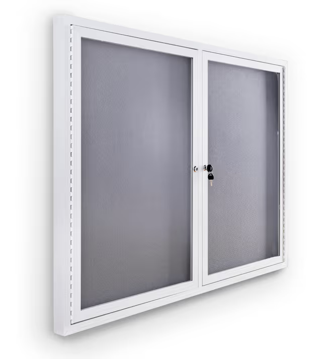 48 x 36 Enclosed Bulletin Board with 2 Locking Swing Doors – White with Gray Fabric