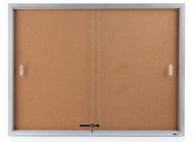 A glass enclosed bulletin board, like indoor corkboards and wall-mount message cabinet, is perfect for locating anyplace where there is heavy foot traffic. The notice display is ideal for use in a classroom or teacher work room for displaying time tables, schedules or upcoming events. Government agencies, hospitals, churches, and post offices can also use this aluminum glass enclosed bulletin board to show essential postings. Whether it is for business or an academic establishments use, this corkboard is an ultimate message center. This notice display cabinet, glass enclosed bulletin board incorporates two shatter resistant sliding tempered glass doors, which permit rapid changes and easy poster placement. Messages can be updated monthly, weekly or even daily with no hassle! This sliding glass door, enclosed bulletin board that comes with a locking mechanism will keep the information secure, yet clearly show the messages to the public. The unit is also sold with hanging brackets and essential mounting hardware for uncomplicated and fast wall-mounting. Once this indoor corkboard is mounted on the wall, users can conveniently change out their message with the sliding door case. This notice display cabinet is available in a larger version as well (see related products on the right hand corner for more options). An indoor aluminum corkboard, like the one seen here makes an excellent communication tool for both public and private institution.