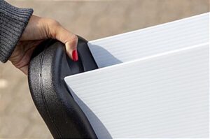 Use this 48 x 36 outdoor changeable letter sign to advertise important messaging in front of your farmers market, congregation center, or fitness studio and update with ease to keep customers engaged. This double-sided display allows you to create different messages on either side for maximum roadside visibility. This mobile 48 x 36 outdoor changeable letter sign includes 421 different black and red characters that allow you to spell out unique information that speaks to your patrons. These letters and numbers use high-quality paint that ensures long-lasting color and are quickly inserted into the five rows of tracks on the white opaque panels for easy updating. These two durable boards curve to fit your portable frame with the included hardware, and all pieces will withstand wind gusts of up to 30 mph. Use the grip handle at the top of the sleek rounded base to tilt your signage and activate two of the four wheels for easy mobility over sidewalks and pavement. Fill each leg with sand or up to two quarts of water for extra stability amid heavy winds or foot traffic. The durable black frame is resistant to rust and other surface damage so your sidewalk display stays looking new for years to come. Grip, tip, and roll this double-sided 48 x 36 outdoor changeable letter board in front of your establishment for roadside messaging that can be updated frequently.