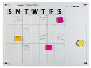 This dry erase marker board calendar is a reusable scheduling tool that allows you to use your wall space to plan the weeks ahead. A five-week layout works well as a monthly tracker for performance or for keeping your appointments in order. Lighter than its glass alternatives, this clear acrylic marker board calendar is easy to mount to your wall with the included hardware. A frameless design lends itself well to any space. The treated writing surface resists ghosting and stains, allowing you to reuse this scheduling tool to plan your days out for years to come. Hang this marker board calendar in your office, school, or workplace to use as an elegant tracker or daily forecasting chart.