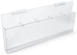 Slat wall Accessory – This attachable brochure rack is great for slat wall panel displays. This accessory can hold either five 4″ wide literature or (2) 8.5″ wide and one 4″ wide materials. It can be attached directly to most slat wall displays without any other mounting hardware. Clear acrylic construction ensures that your brochures are securly positioned onto the slat wall but customers of visitors will still be able to read the entire front of the brochure or catalog you choose to display. Use in conjunction with any of our sign holders to be even more informative.