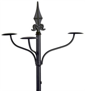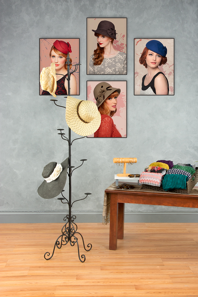 This wrought iron style hat rack is perfect for any boutique or souvenir store. Each black decorative stand includes (2) options for hanging items. The hat rack includes (5) 3 hook attachments for caps, fedoras or sunhats. The baseball cap fixture also supplies (2) black 8 prong pieces for coats or scarves. The hat rack hooks rotate to make shopping hassle free for customers. A decorative finial topper and base create a classy design for the baseball cap stand.