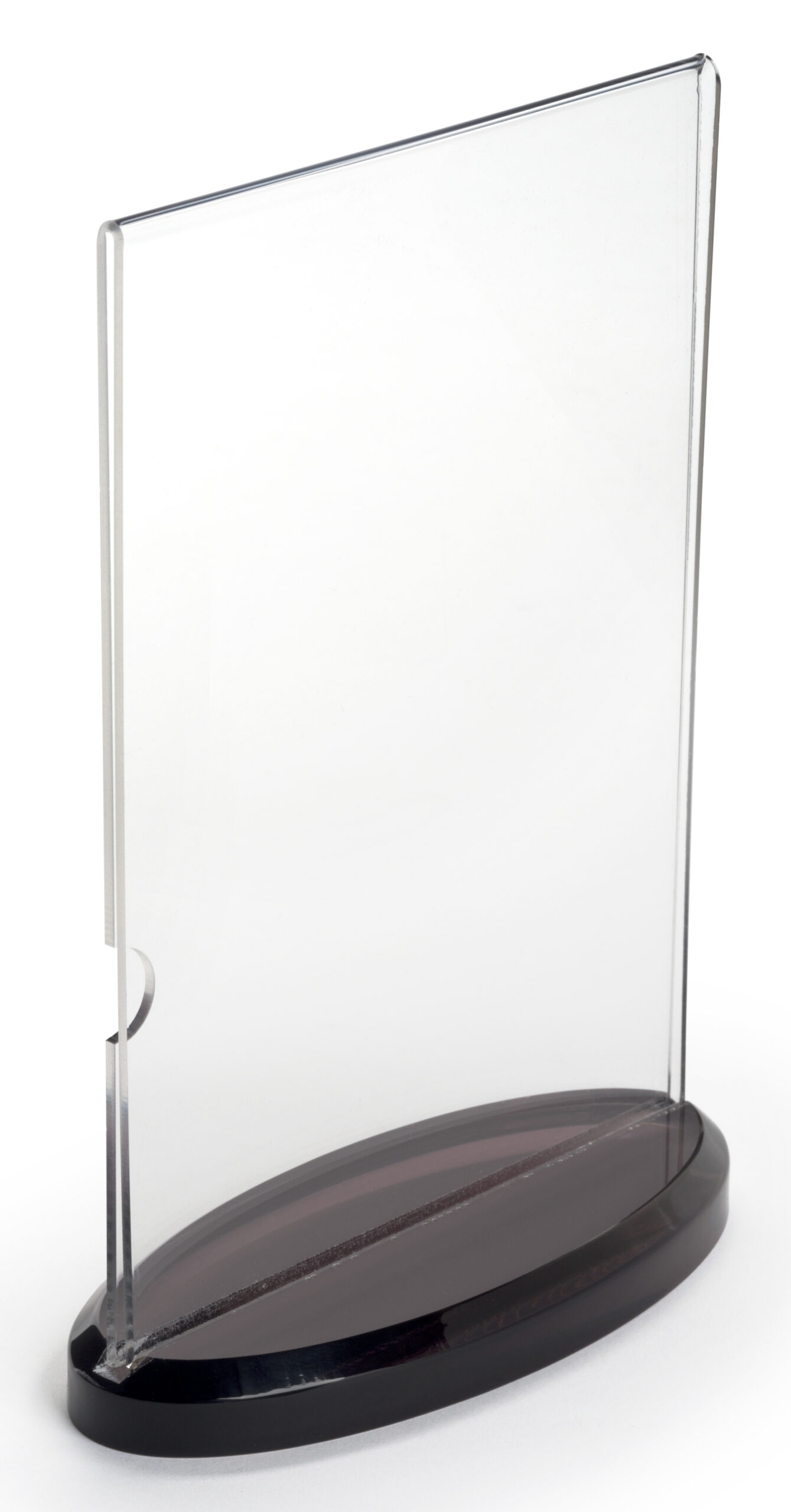Showcase menu designs or special announcements with a table tent holder with thick acrylic. An oval base with a smoked coloring provides a sleek appearance while taking up minimal tabletop space. The side loading table tent holder offers a double sided frame for 5” x 7” signs. Useful for a variety industries ranging from restaurants to trade show to retail shops, switching out product or menu designs as needed is easy. Polished edges offer a smooth finishing touch that accents a graphic sign. A timeless design allows this table tent holder to maintain years of use!