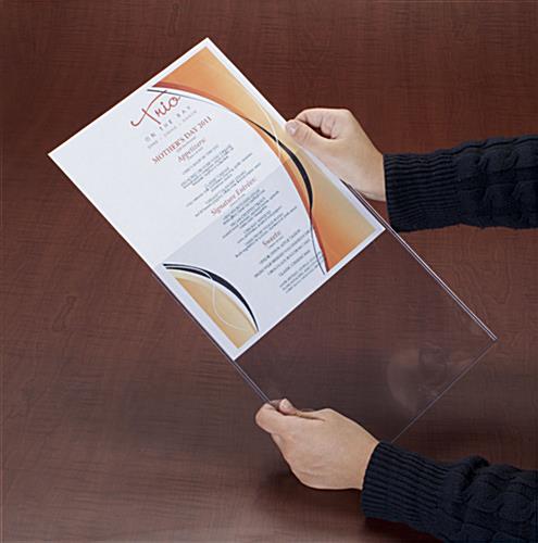 This poster sleeve for businesses showcases 5″ x 7″ advertisements. These displays work well for custom signs. This poster sleeve, often referred to as an art holder, is ideal for placement next to a checkout register or on top of a store fixture. These print displays come with an easel for displaying on a counter top. In addition, this poster sleeve may hang a picture on the wall with double sided tape. The tape is not included, but can be bought at most local hardware stores. This poster sleeve is designed for a single sided custom print. This picture holder loads at the top when in portrait format or on the side if in landscape orientation. This poster sleeve is popular for displaying branch hours in a bank or menus in a restaurant. This holder for art makes changing out images a breeze, as graphics simply slide in. This frame is a poster sleeve that is versatile. These displays are versatile because they can be used with an easel or mounted on the wall vertically or horizontally.