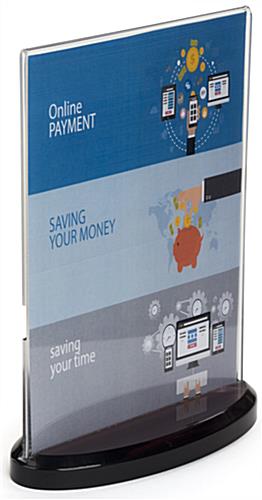 Showcase menu designs or special announcements with a table tent holder with thick acrylic. An oval base with a smoked coloring provides a sleek appearance while taking up minimal tabletop space. The side loading table tent holder offers a double sided frame for 5” x 7” signs. Useful for a variety industries ranging from restaurants to trade show to retail shops, switching out product or menu designs as needed is easy. Polished edges offer a smooth finishing touch that accents a graphic sign. A timeless design allows this table tent holder to maintain years of use!