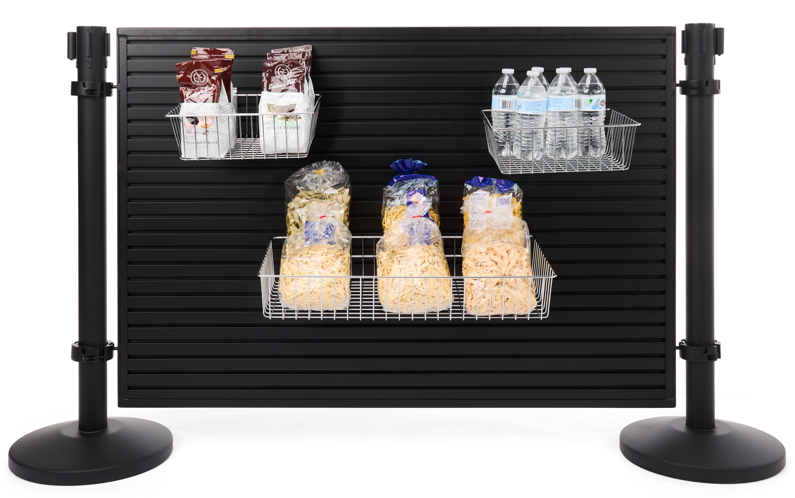 Looking for a sturdy and durable queue line solution that can withstand high foot traffic and attract impulse purchases? Look no further than this 50″ x 36″ slatwall merchandiser. Constructed from powder-coated aluminum, this unit is built to last for years. Four pole collars with foam backing attach the panel to the stanchion, minimizing any scratches or scuff marks. The QueuePole stanchions feature a 6.5′ black belt that can be connected to other stanchions for a variety of setup options, allowing you to customize your queue line and merchandising opportunities. Two sizes of metal shelves and baskets are available as an optional accessory to display your retail items and are easily configurable on the slatwall display. Additionally, a large and small panel can be purchased and added to this floor-standing bundle for even more configuration options and queue-line customization. Perfect for forming queue lines and acting as a point-of-sale display for commercial establishments, this slatwall merchandiser is the ideal solution for your queue management needs.