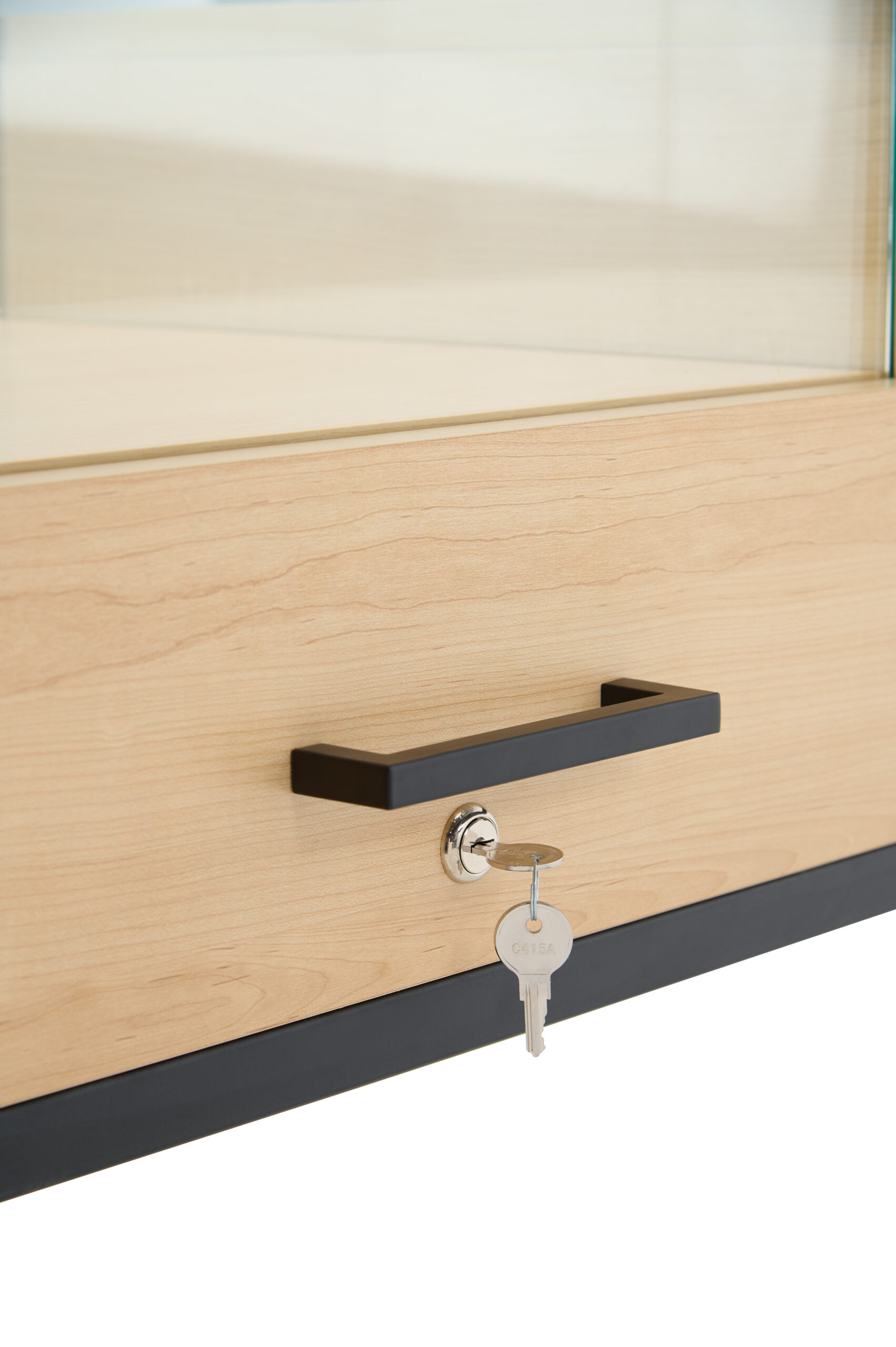 54″ Retail Showcase Display Table with Tempered Glass, Locking Drawer – Maple