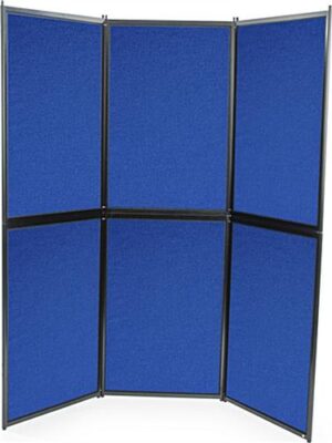 Great for conferences and trade shows, the 6 panel hook and loop display board is a portable system that is quick to set up and break down for on-the-go representatives. The 72-1/2” high backwall is an accordion style folding unit that can be arranged into different positions such as a 3-Dimensional triangle and a traditional tri fold stance. When the portable hook and loop display board is not in use, it can be stored in the travel case with shoulder straps to avoid damages and for easy transport between exhibitions. Included with the systems are (2) sets of (3) panels that are stacked on top of each other for a taller 73” high backwall. Light blue on one side and dark blue on the other, the double sided tri fold provides the option of different exhibition booth backdrops. The hook and loop receptive fabric on either side of the display board is a quick mounting solution for easy assemblies in which accessories such as flyers, brochure holders, and magazine pockets can be affixed. Each floor standing folding unit is a great portable presentation tool!