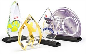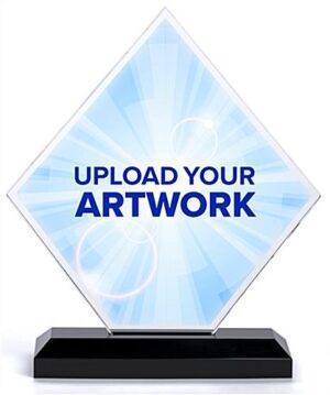Choose this square diamond recognition trophy to recognize top performance in various industries and let them know you appreciate all their hard work. Our unique printing process allows you to create custom graphics on both sides, making an exceptional 3D effect award. This acrylic square diamond recognition trophy with base has a 6.75″ x 8″ full-body, full-color print area providing a creative branding opportunity. This award is the perfect lightweight, versatile way to recognize the month’s employees, teacher of the year, or goal accomplishments. In today’s environment, it is essential to express appreciation to loyal employees and those that help your business, charity, or organization succeed. Please place your order today for this lightweight acrylic square diamond recognition trophy with base and make your honorees feel as honored as they deserve.