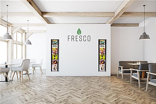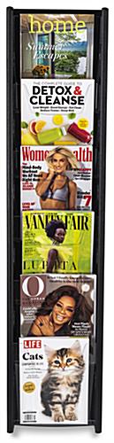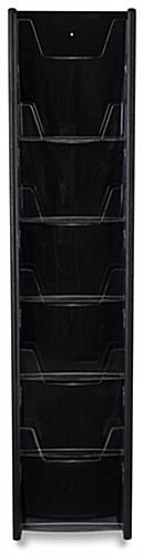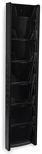 This wall mounted 6-tiered magazine rack is constructed of black-stained solid oak with acrylic front panels that provide an unobstructed view. The landscape brochure holder keeps reading materials up to date and accessible for people to use in waiting rooms, schools, libraries, cafes, and more. Our solid oak wall mounted 6-tiered magazine rack with angled clear acrylic panels will help keep literature organized and wrinkle-free. Wooden Mallet manufactures this stylish waterfall designed brochure holder in the USA. The catalog display ships with pre-drilled holes on the backside of the unit for an effortless installation. Easily mount this lightweight pamphlet holder to a flat surface in your office to add a more stylish yet professional look that works perfectly in any real estate agency, health care facility, reception area, and more. Use this durable black wall mounted 6-tiered magazine rack with transparent vertical pockets to neatly arrange literature for waiting customers.