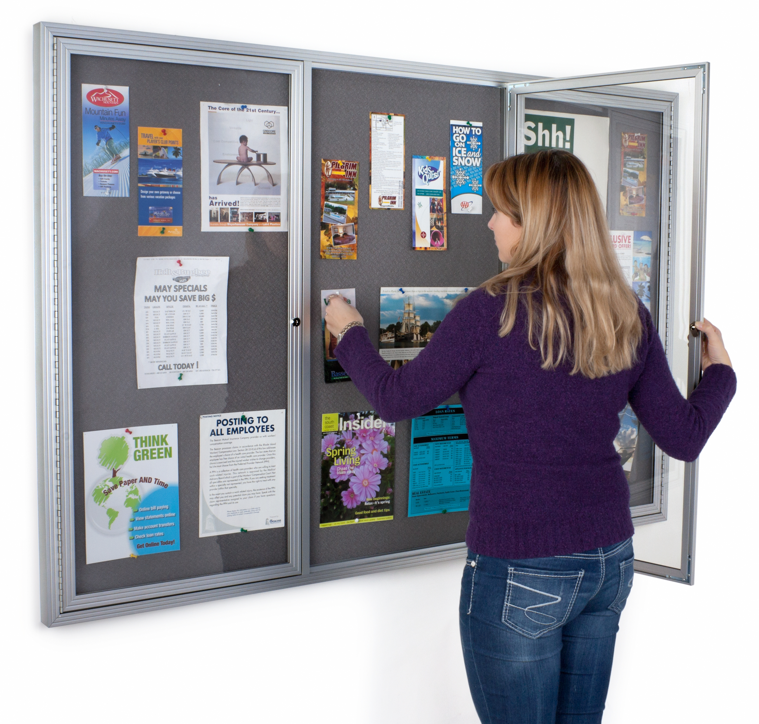 72 x 48 Enclosed Bulletin Board with 3 Locking Doors – Silver with Gray Fabric