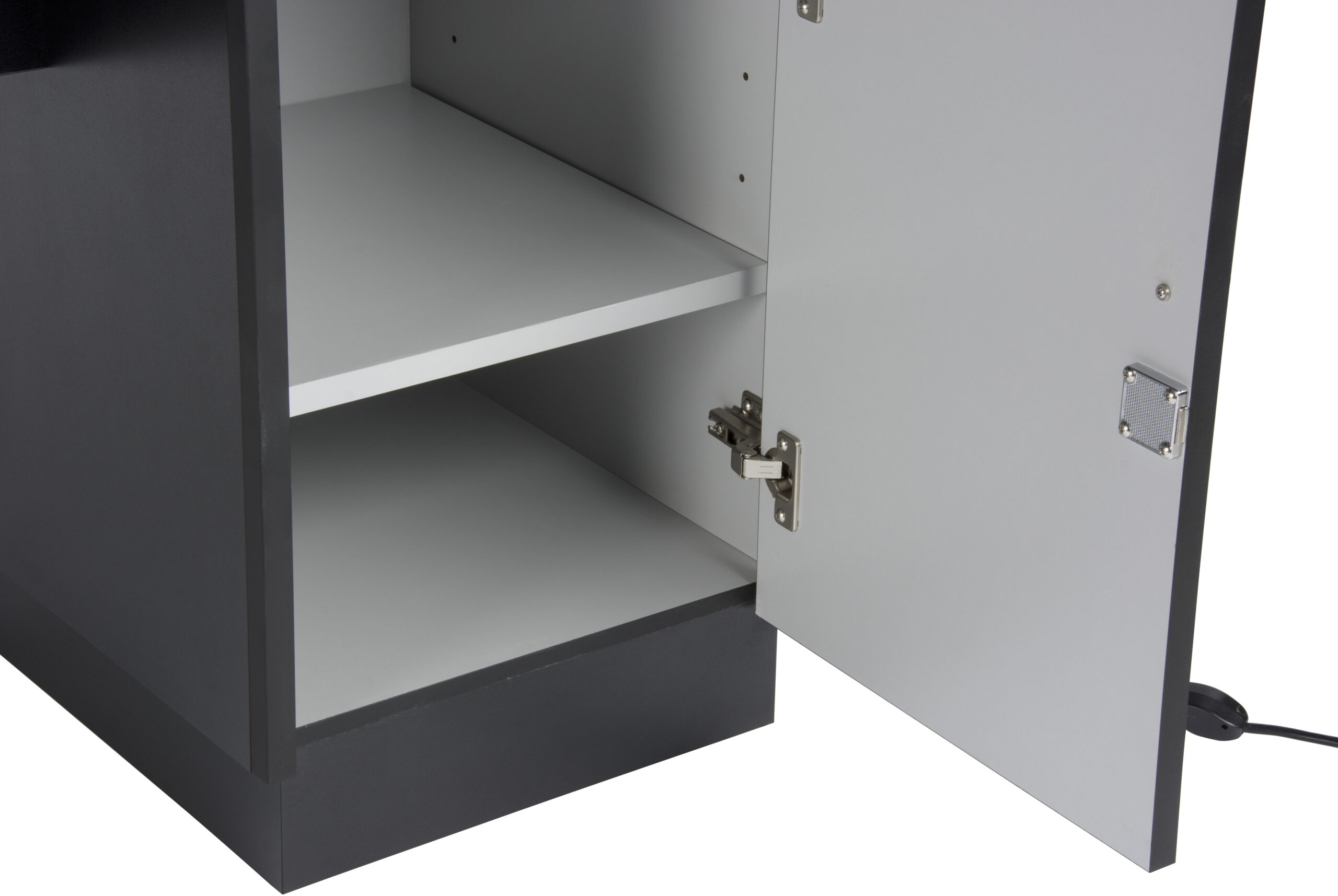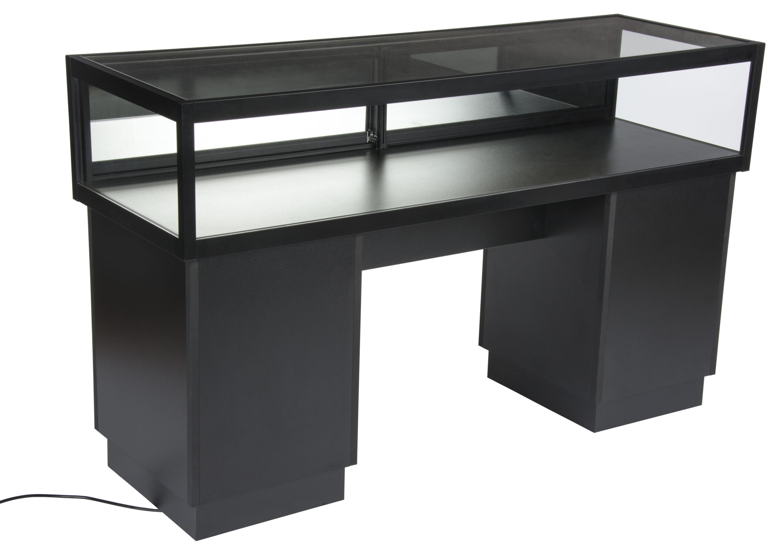 This lockable jewelry display case is a secure and stylish addition to any retail store. With a 60” wide locking glass top cabinet, a wide variety of products can be showcased without clutter and well lit with the interior LED lighting strip. Each black jewelry display case has a cut-out for employees or customers to sit down, allowing comfortable access to the counter. Conveniently both the showcase and two storage cabinets use the same keys, making it easy to assist customers and add new product as needed. Shipped pre-assembled, the tempered glass top exhibit is made with an aluminum frame on top of a MDF base. Durable enough for any busy store environment, the LED strips set along the upper edges of the counter provide lighting to highlight merchandise held within. At 21” high, the base is tall enough for anyone to sit down at the display case and peruse your products at their leisure.