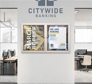 This 60″ x 36″ locking cork board features an enclosed design to securely display student work, announcements, and schedules in school classrooms and hallways. The silver aluminum frame is durable for long-term use. This two-door locking cork board ships fully assembled for hassle-free set up at universities, community centers, and post offices. The tackboard can hold messages, notices, and event postings with pushpins and tacks. These enclosed aluminum frames include keys to switch out printed content easily. This indoor wall-mounted display can keep employees up to date on schedule changes. This silver locking cork board can be used as a centralized location for announcements in schools, visitor centers, and more.
