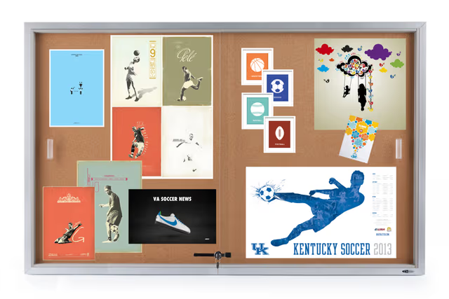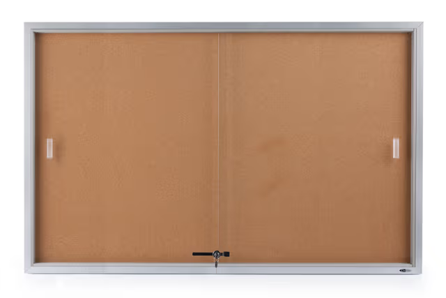 This enclosed bulletin board is ideal for posting messages, news, memos, schedules, and notices. Each enclosed bulletin board with silver aluminum frame mounts to the wall in a high traffic area. Each cork unit has a brushed silver finish with natural color backing. This five-foot wide enclosed bulletin board has a large interior surface. The self-healing cork surface allows users to tack a significant amount of information. Each enclosed bulletin has a locking mechanism, and is a great purchase for schools, classrooms, offices, libraries, and community centers. This indoor display has sliding tempered glass doors to make quick updates and changes a breeze. The enclosed bulletin board keeps information secure inside. An enclosed bulletin board, also known as an indoor display, is sold with hanging brackets and mounting hardware. The cork backing, tempered glass sliding doors, and silver aluminum frame will complement a range of environments. An indoor bulletin board keeps guests, visitors, students, and employees. informed about important events.
