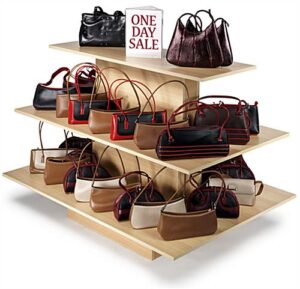 Use a three tiered table to define a space or add interest to a retail window display. This table display fixture is versatile and will draw attention to a sale or new product line. These table displays, which are store fixtures, would work well in an apparel outlet or gift shop. The table display can hold merchandise such as clothing, jewelry, or collectibles. Each shelf has a maple melamine finish. The table display is durable and has more than 30 ft² of display space while only taking up a 17.5 ft² area.