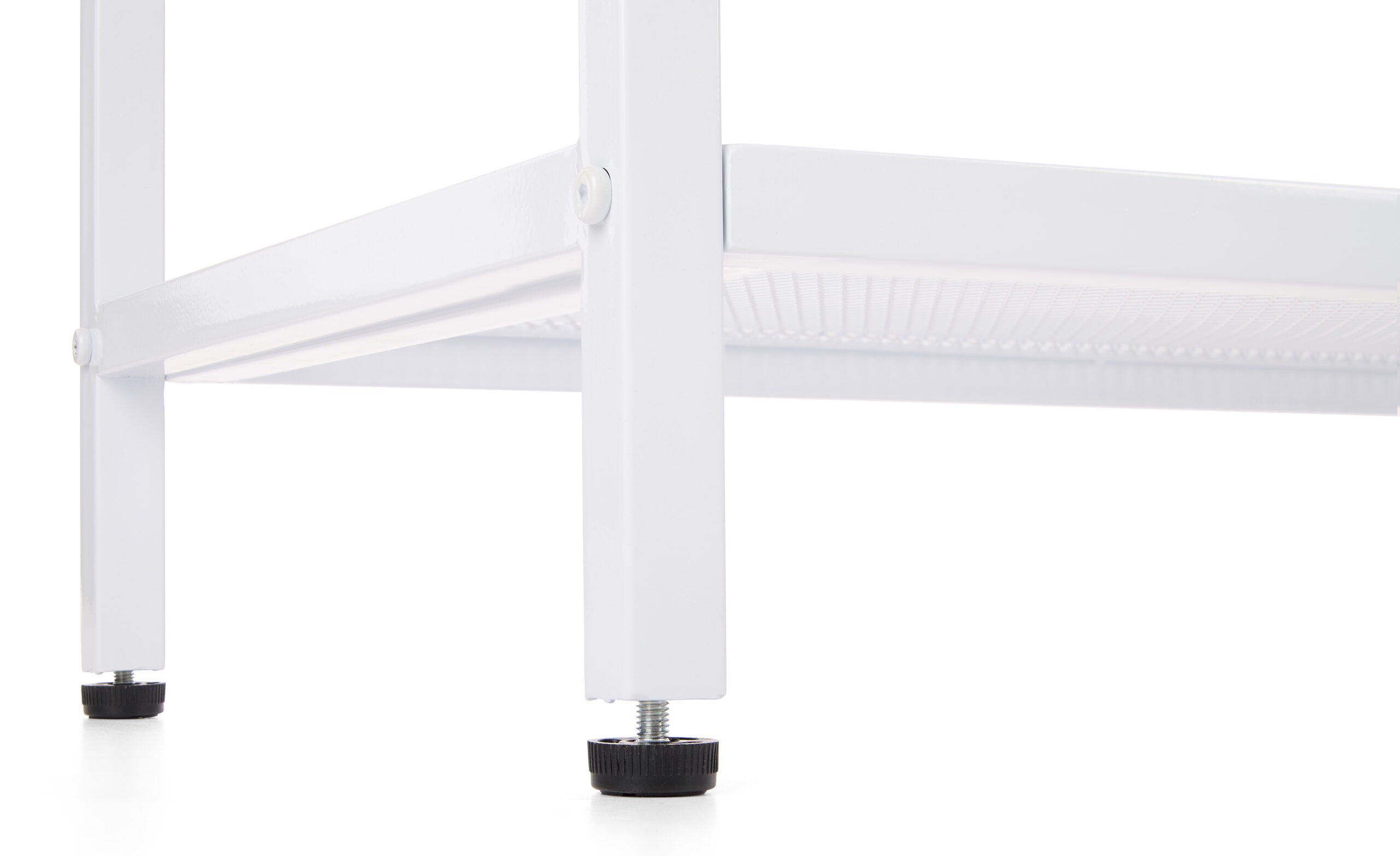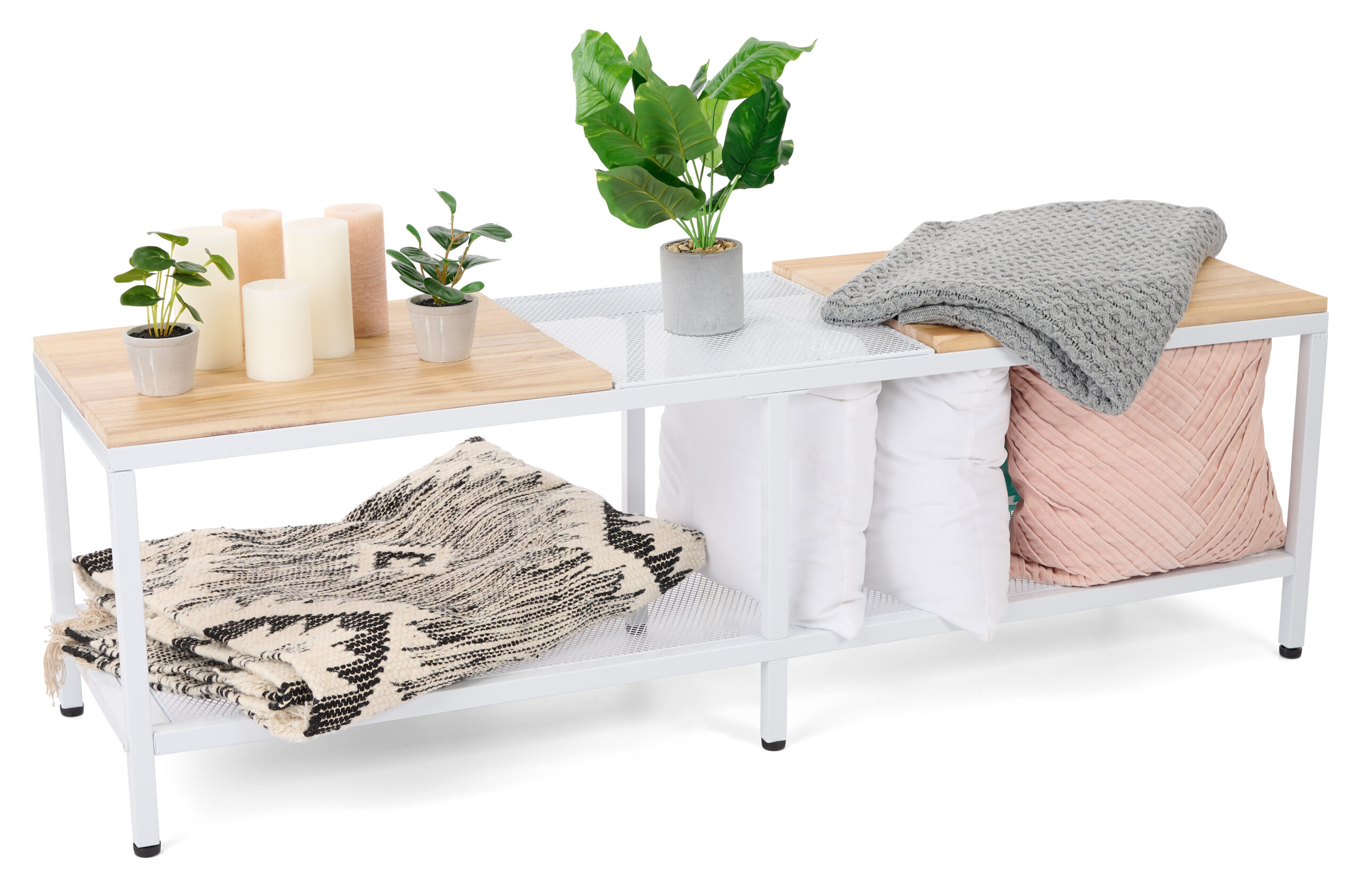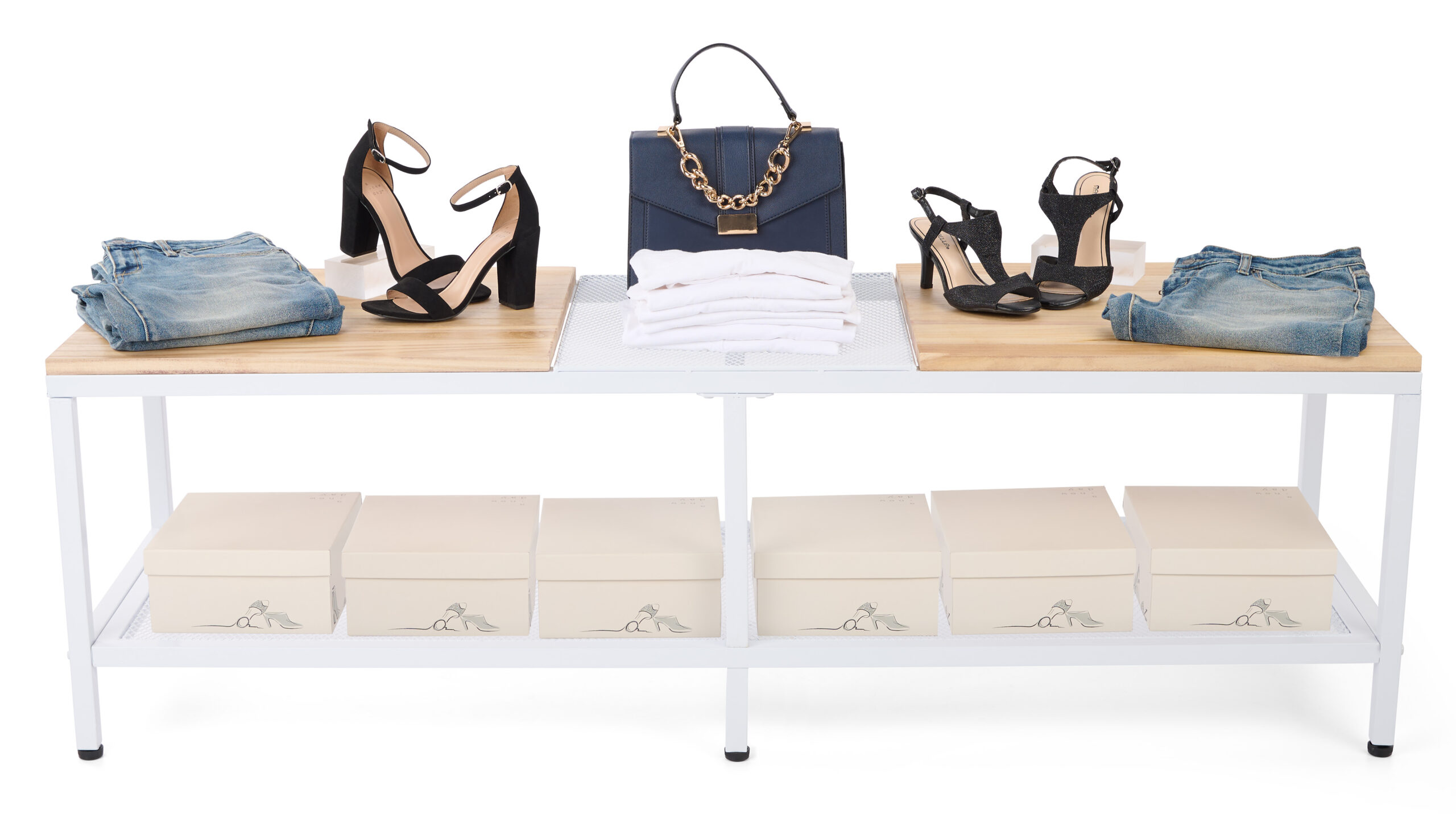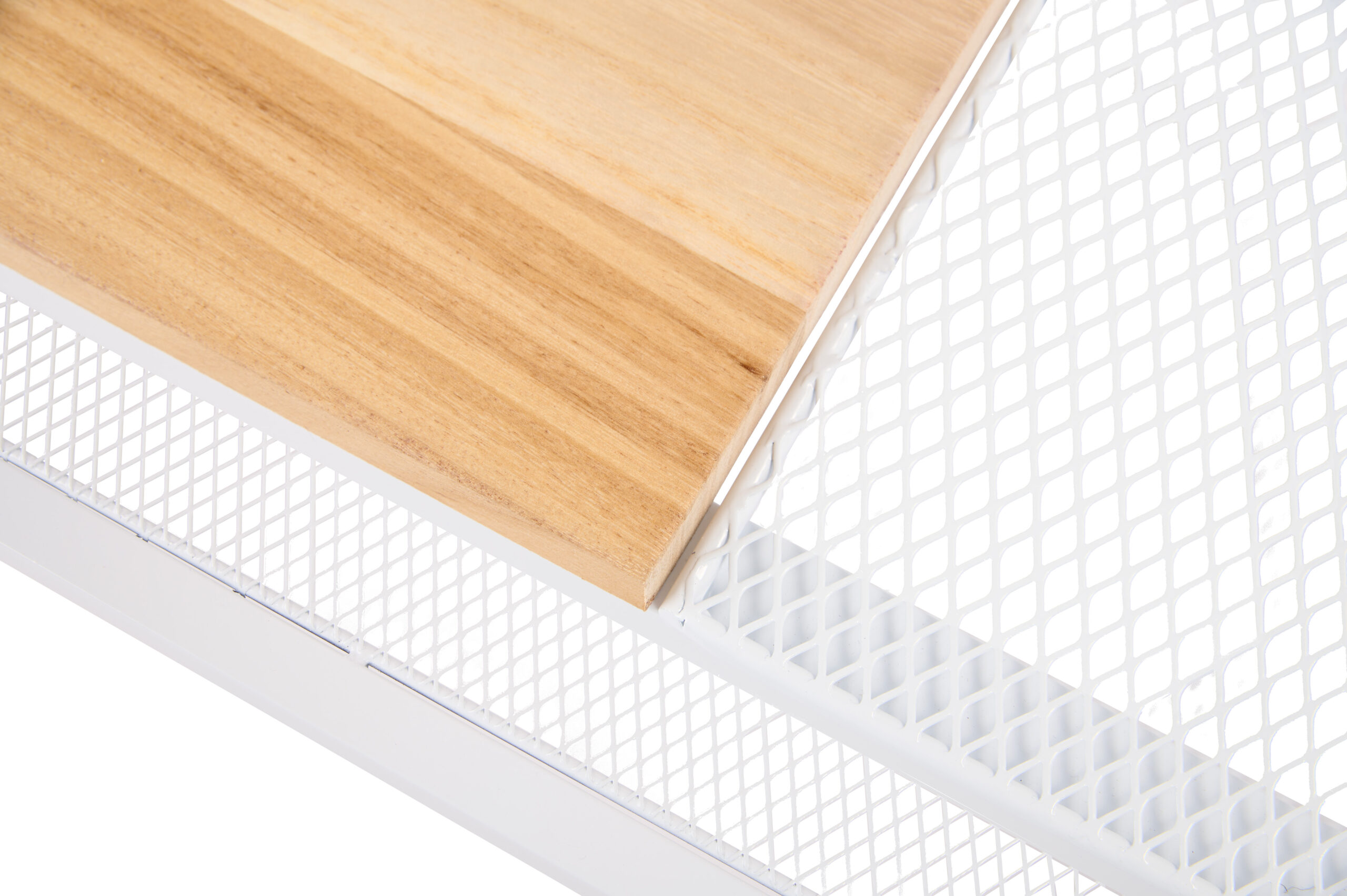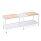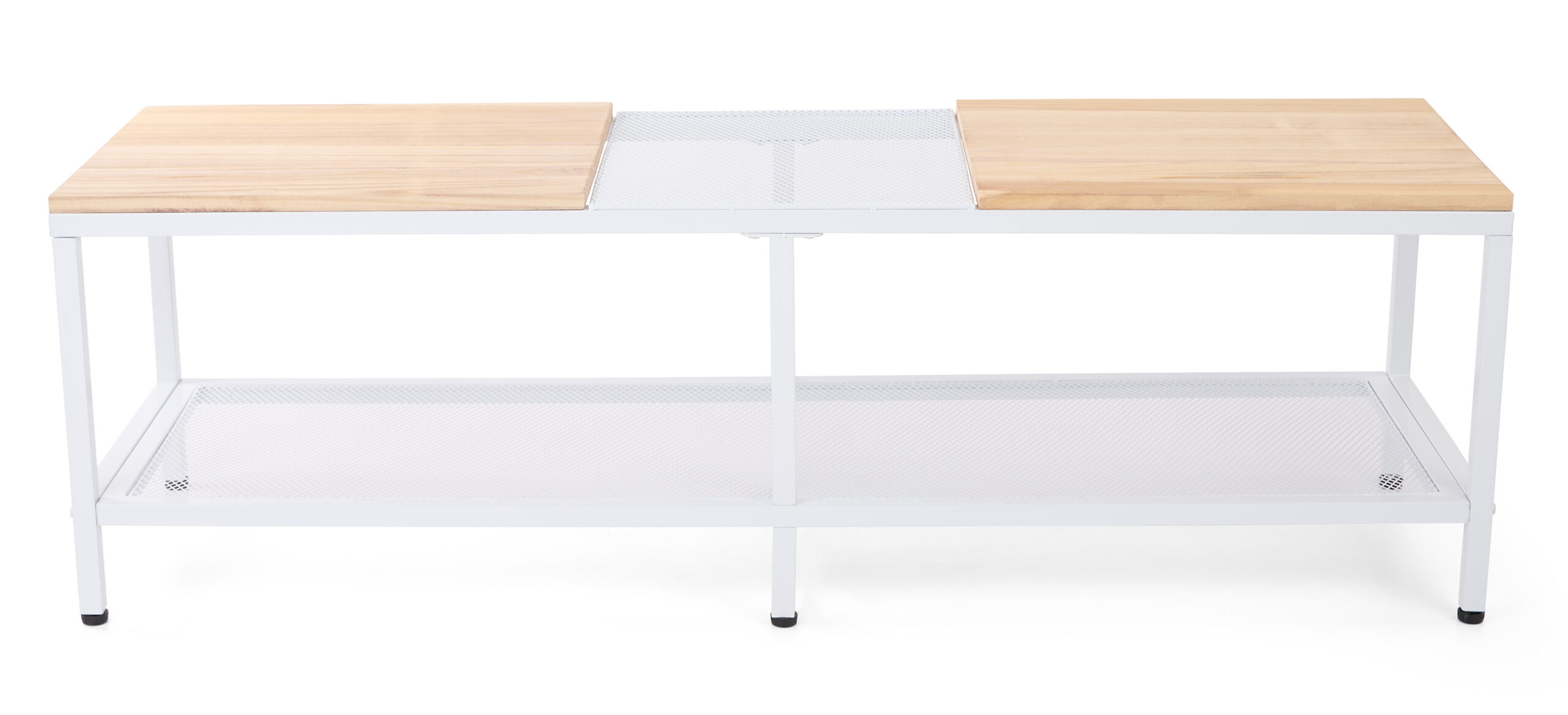 60″w Wood and Steel Display Table, Paulownia Countertops w/ Iron Mesh Shelves – White