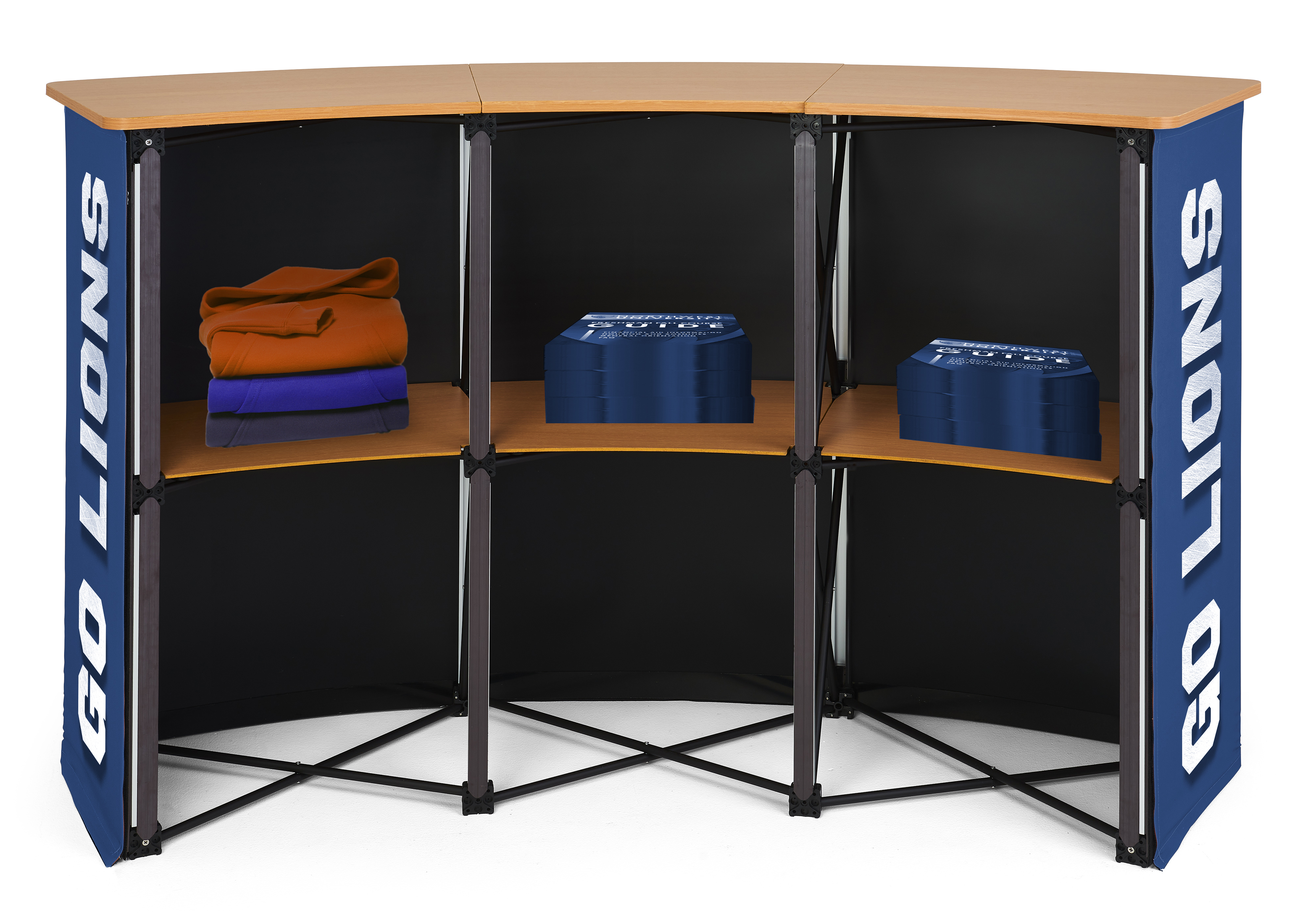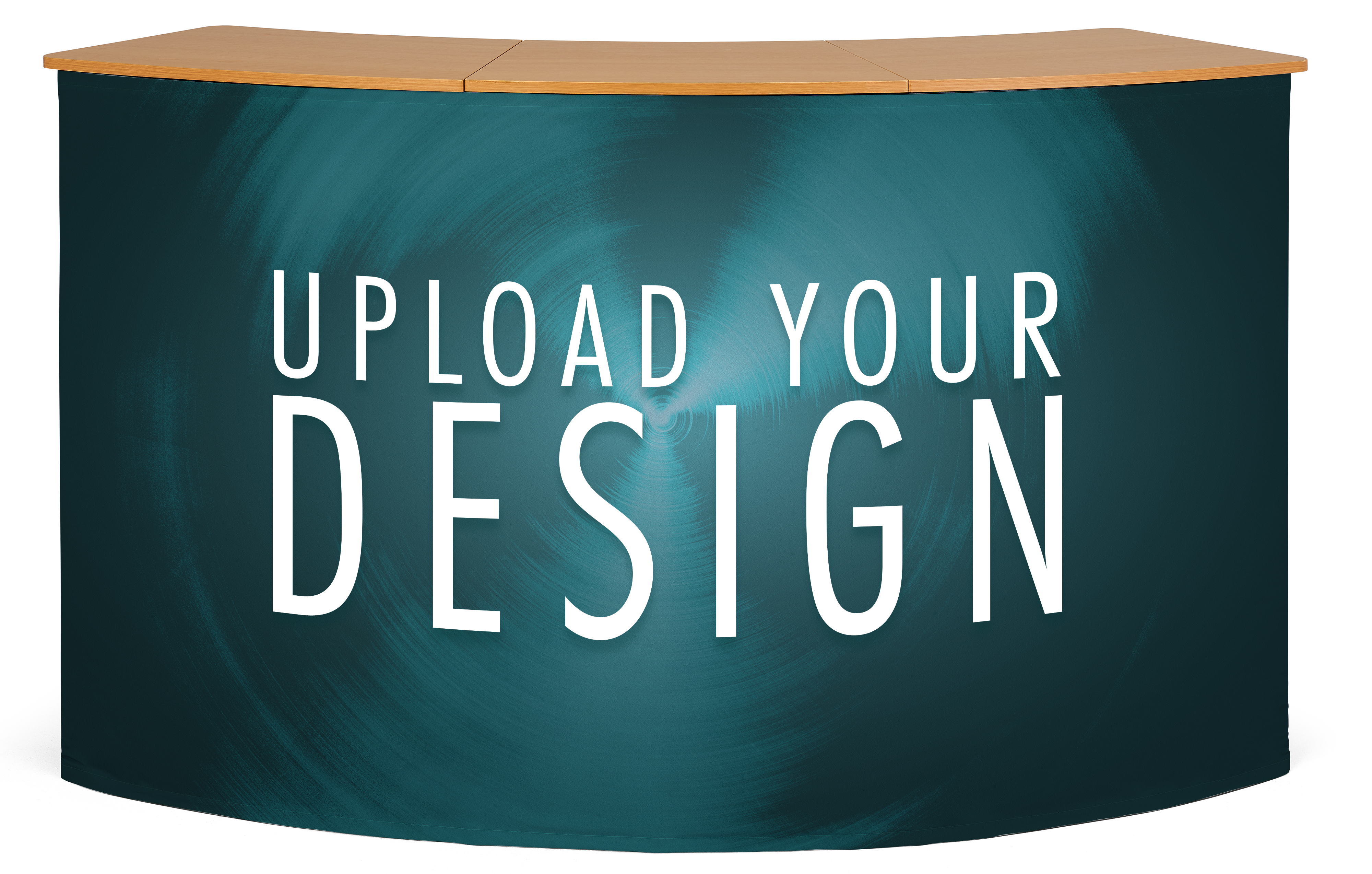 This pop up counter stand with eco-friendly graphics is convenient for businesses that often travel to trade shows, exhibitions, or other promotional presentations. The display unit is constructed from a lightweight, yet sturdy aluminum pop-up frame covered on three sides by black hook-and-loop receptive fabric. This portable pop up counter stand with eco-friendly graphics features a slightly curved, wooden finish MDF counter area over 5 feet wide. Our high-quality print substrate is made of soft knit polyester material derived from 40% recycled water bottles. It also comes with a mobile carrying case with wheels and a handle and carrying straps for easy transport at your next trade show. Under the portable desk display, inner shelves provide a storage area for promotional product samples, supporting literature, snacks, beverages, and more. Our curved pop up counter stands with eco-friendly graphics are a sustainable addition to your exhibition booth.