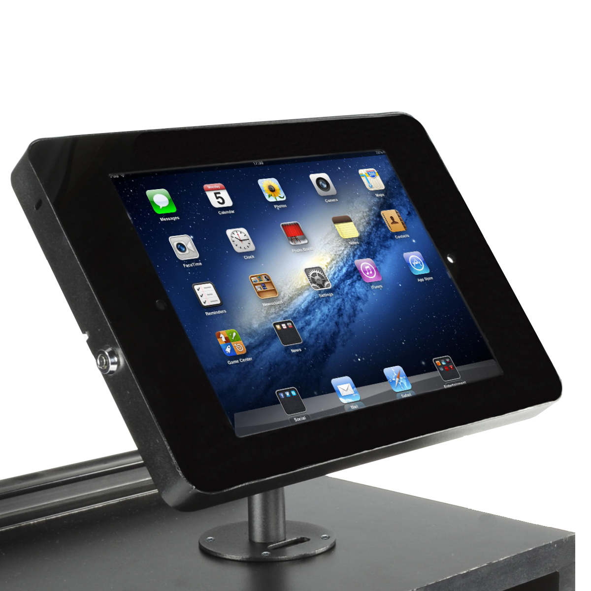 The trade show counter with iPad holder is a great display stand for exhibitions, business seminars, and similar events. The collapsible design of the table provides easy setup of the kiosk which can be just as easily disassembled into a portable carrying case for transportation between events. The portable counter with iPad holder that screws onto the countertop with included bolts and features a locking enclosure is a secure way to promote products and company information with media technology at events. The tablet display with a hidden home button tilts and rotates into different viewing perspectives and accommodates several different iPad models. A black touch fastener adhesive which can display hook and loop receptive accessories such as literature pockets and posters, covers the slightly curved 5’ wide MDF truss counter with iPad holder and hides (1) inner storage shelf. A display stand is a great way to get customers attracted to your company’s exhibit booth with an eye catching kiosk and screw-on tablet enclosure.