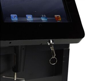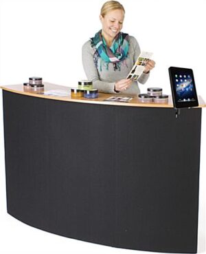 The portable counter with iPad mount is a great display stand for businesses that often travel to trade shows and other promotional events. With the included carrying case on wheels that features a handle and carrying strap, the table and tablet enclosure is easy to transport to different exhibitions and the like. The surface of the trade show counter with iPad mount is constructed of MDF with a wooden finish and the bottom is covered by a black hook and loop receptive fabric which is able to hold hook and loop accessories such as posters, signs, and literature holders. The included tablet enclosure clamps to the table as an interactive tool for event attendees and accommodates many iPad models. A hidden home button and key lock is featured with each counter with iPad mount which makes it great for public events and can rotate and tilt into different positions for presentations. The black finish of the bracket complements both the silver aluminum structure of the table and the optional black fabric.
