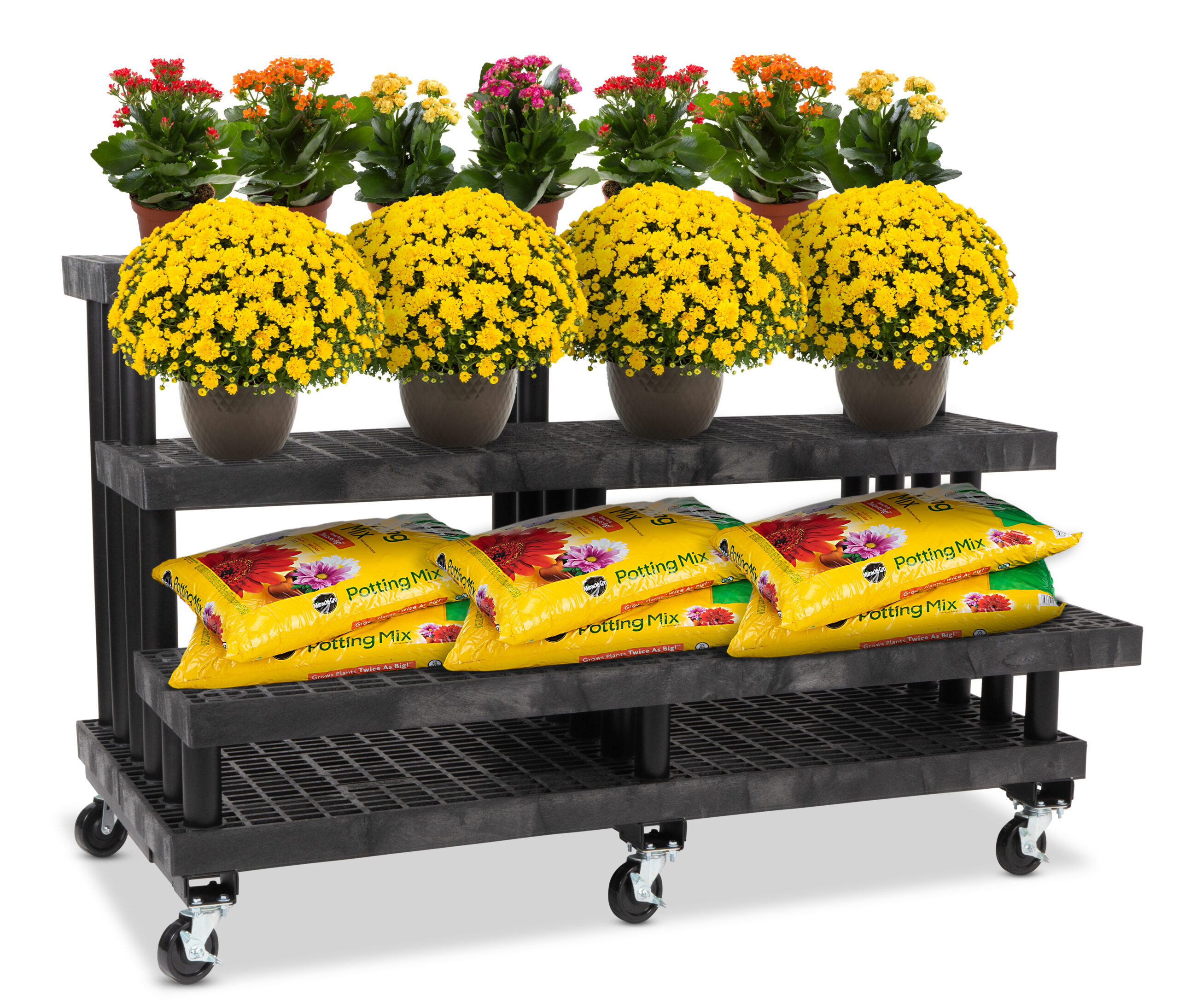 This rolling commercial nursery rack is the ideal merchandising addition to your garden center or greenhouse. Our garden center display features a sustainable weather-resistant design with 6 heavy-duty caster wheels for quick and easy adjustability at your farmstand, corner store, or greenhouse. The 3-tier nursery rack provides ample space for merchandising your products to create an impactful shopping experience. Mix and match from our garden display center series to have a unique and complete setup at your floral shop or retail store.