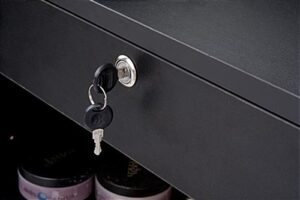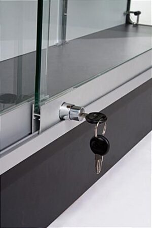 This retail store counter features the best of both worlds, incorporating a sizeable countertop area with a front showcase for displaying your merchandise. The top features a deep well for placing up to two cash registers. All glass is tempered for safety and the front sliding doors are also lockable. Inside the black retail store counter are two glass shelves that are fully adjustable to accommodate various sized items. On the rear side there are two locking drawers and a sizeable amount of storage space for replacement stock and other supplies. The store counter ships flat for customer assembly.