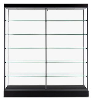 This 72″ glass showcase cabinet features eight LED top lights illuminating trophies, merchandise, sports memorabilia, and more. The locking sliding door makes it simple to exchange or move fine china or merchandise with a sense of ease while also safeguarding valued items. The black glass showcase cabinet has four open panels with a tempered glass back to display from all angles and minimize obstruction. The ten tempered-glass shelves are height adjustable and when evenly spaced there is a 10.5″ shelf clearance height. The middle panel makes for different configuration on both sides, allowing oversized items such as vases and trophies to be staged. The attached wheels allows the unit to be portable throughout showrooms, lobbies and auditoriums . The shatter-resistant tempered glass protects the safety of employees when re-configurating displayed items. Use this glass showcase cabinet to showcase students’ and alums’ sports memorabilia, large home decor items, and fashion merchandise.