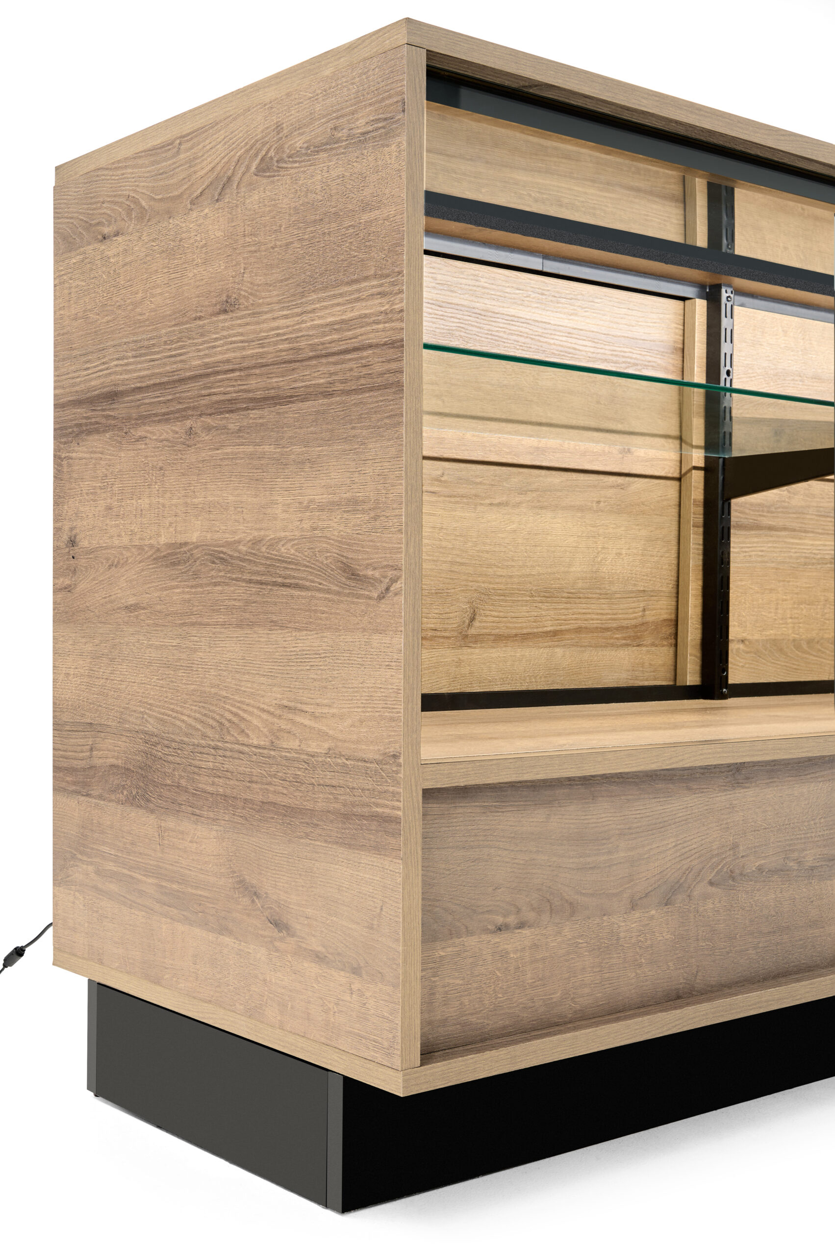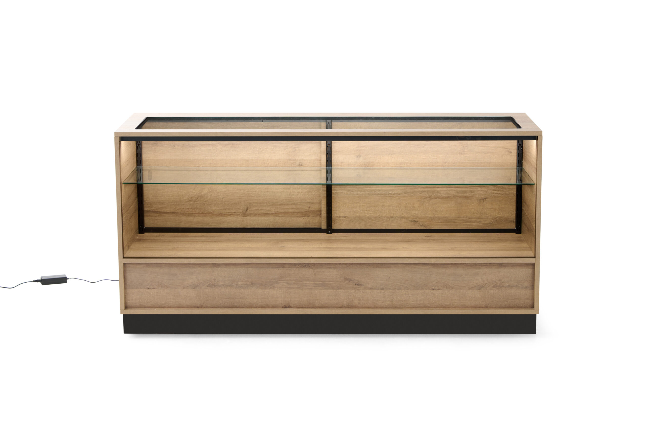 This 72″ wooden display showcase elevates your retail space and enhances your checkout counter experience with an eco-friendly touch. Available in light neutral brown or coastal grey finishes, this stunning full-vision display case is made from FSC-certified particleboard, ensuring sustainable sourcing and environmental responsibility. It features lockable sliding doors, providing security while showcasing your products, and includes convenient open storage in the back for easy access to additional items. The top of the display case features a glass surface with a 20 lb weight capacity, perfect for highlighting premium items. Inside, you’ll find an adjustable tempered glass shelf with a generous 40 lb weight capacity, allowing for flexible and secure product arrangement. This beautiful showcase features energy-efficient LED lighting, controlled conveniently by a remote, to create a captivating front view that attracts customers’ attention. This unit also features levelers for uneven floors and a sleek black toe kick to conceal any scuff marks that can occur over time. The unit arrives fully assembled, so you can set it up and display your merchandise immediately. This wooden display showcase is a perfect solution for any retailer looking to elevate their retail space with a versatile, visually striking, and eco-friendly counter.