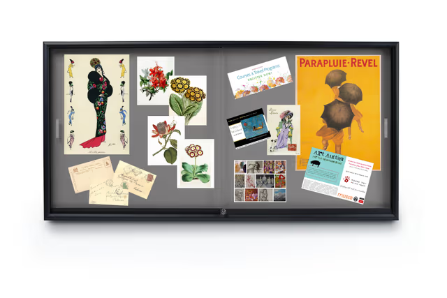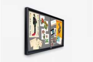 - 72″ Wide by 36″ tall wall mounting fixture to post photos, messages, and notices to the gray interior.